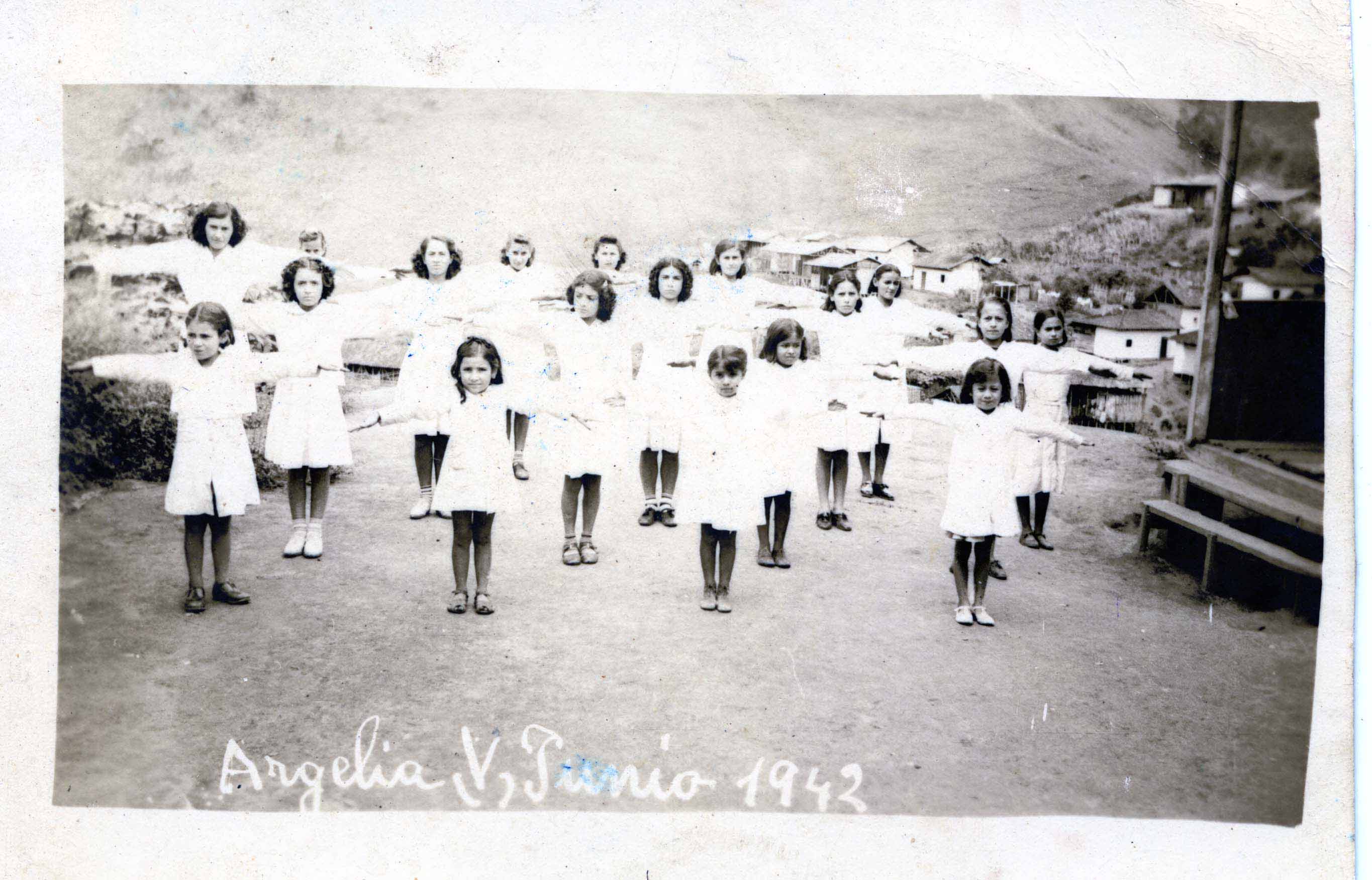 Argelia, Valle del Cauca. Fundado en 1904, por Manuel Mejía, José Antonio Murillo, Epifanio Chávez y Justiano Hincapié. Municipio desde 1956. Escuela Manuel Mejía Vélez. Observamos grupo de alumnas bien organizadas haciendo ejercicios para estirar los brazos. Se aprecia las casas y la montaña