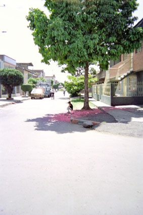 Pérez Domínguez, V. F. (2005). En la imagen se puede apreciar una vía pavimentada y junto a ella, en una esquina, un árbol de Pomarosa en florescencia, se destaca la textura de color fucsia en el suelo, generada por la flor. Santiago de Cali: Biblioteca Departamental Jorge Garces Borrero.