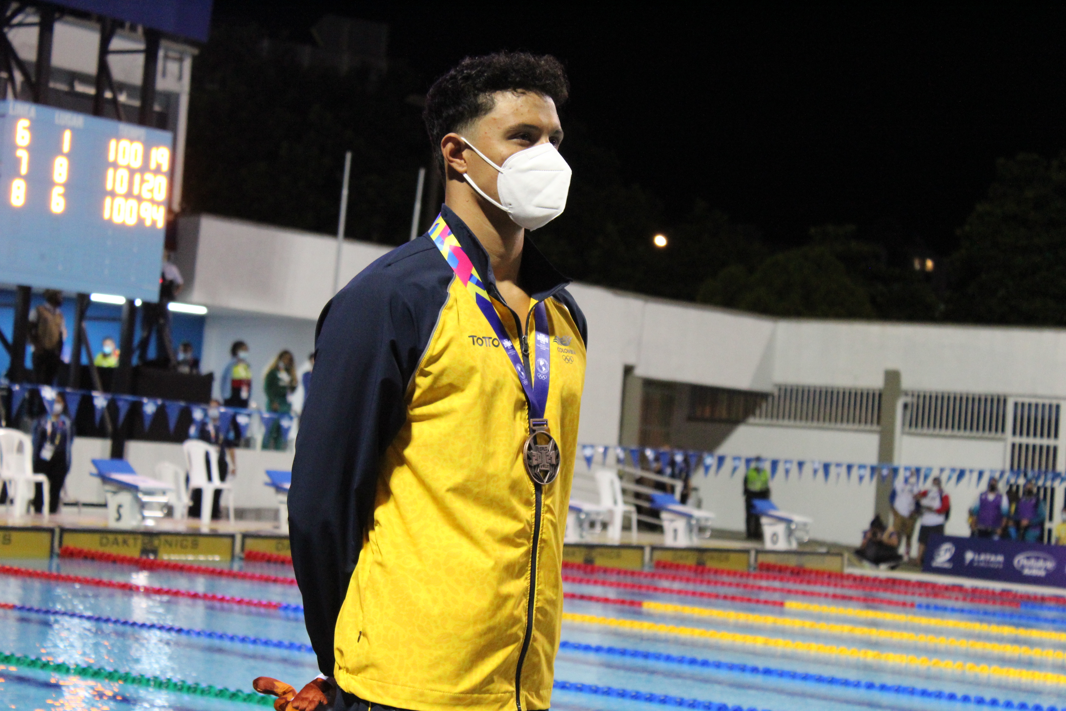 En el registro fotográfico apreciamos a Santiago Angel Corredor Zabala, ganador de la medalla de bronce por destacarse en una de las pruebas de natación en los "I Juegos Panamericanos Junior", llevados a cabo en la ciudad de Cali.