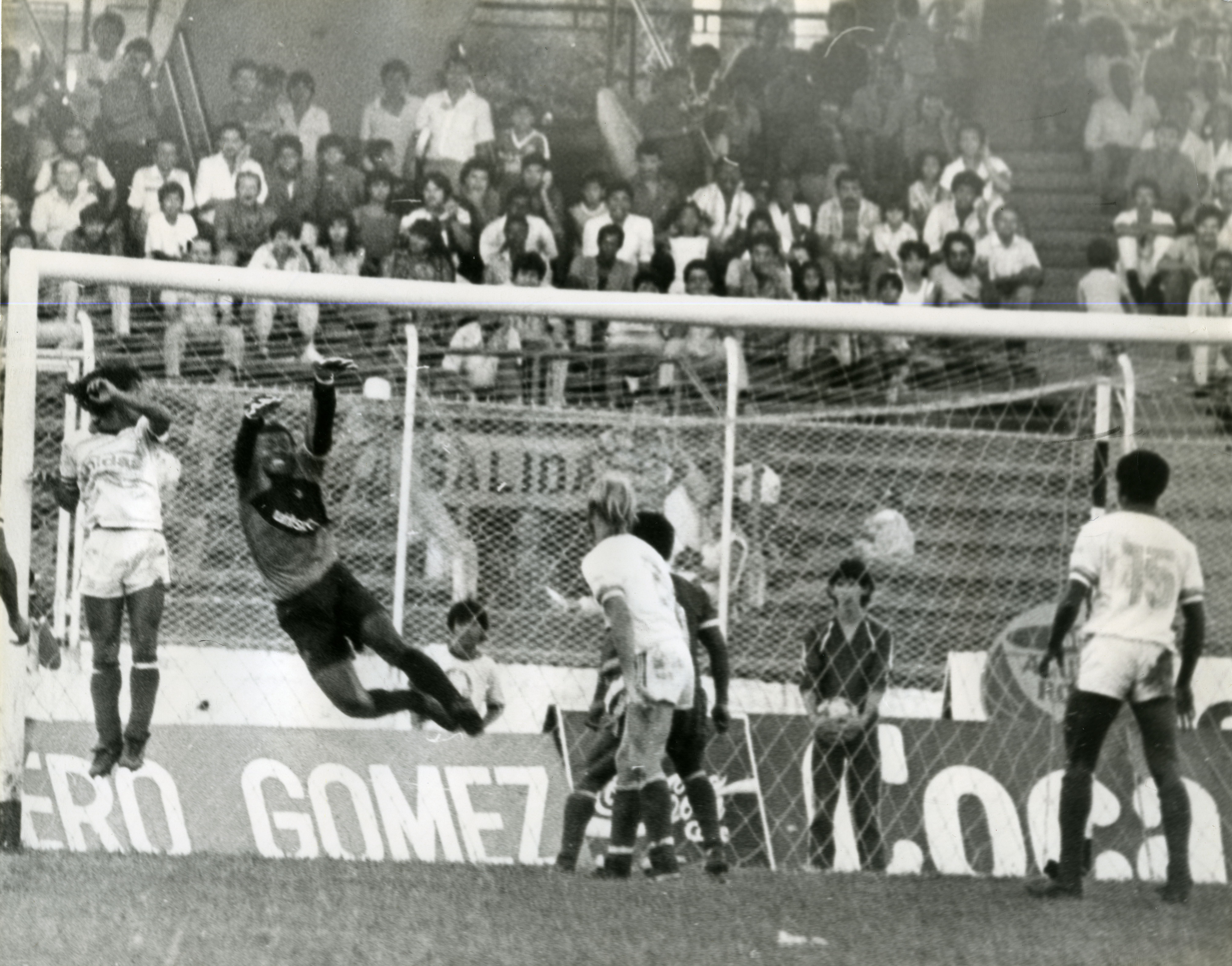 Partido de fútbol América vs Medellín en el estadio Olímpico Pascual Guerrero. Se aprecia al arquero en escena y jugadores de los dos equipos