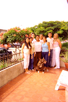 Plano Medio. En la terraza de una vivienda con piso de color salmón. Puesta en escena de un grupo de personas. Al fondo algunos árboles de follaje abundante.