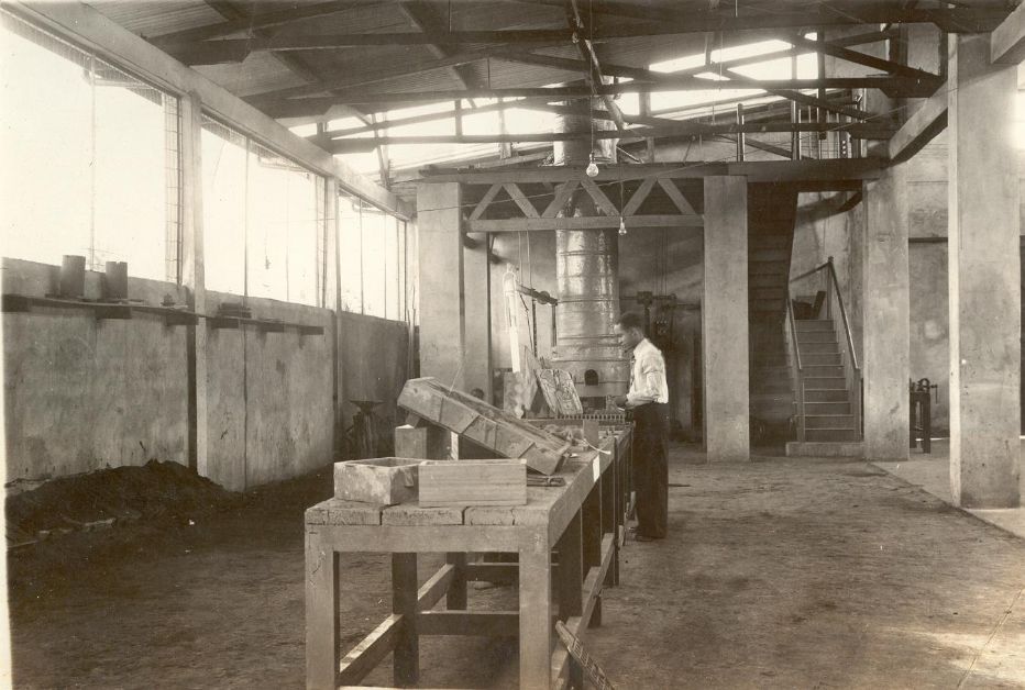 Escuela de Artes y oficios, taller de fundición, estudiante en práctica