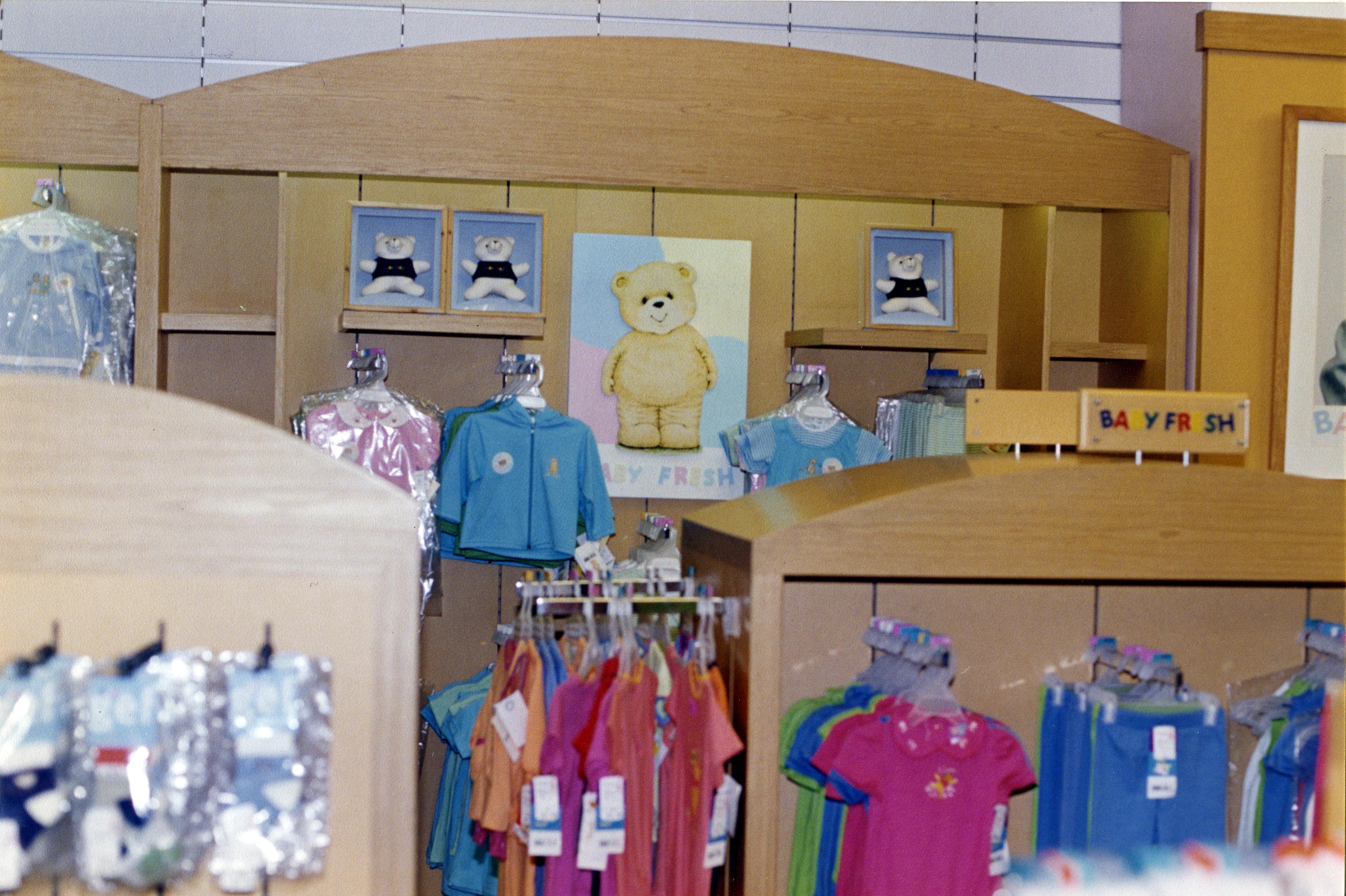 En la gráfica se observan estantes y ganchos que sirven para la exhibición de ropa para niños de la marca baby fresh.