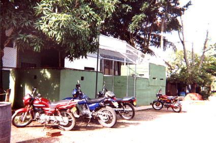 Plano general. Imagen tomada en exterior, donde se puede apreciar la fachada de una estación de policía con muros de color verde y reja en la parte superior. En la parte exterior, algunas motocicletas estacionadas.