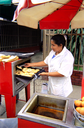 Plano medio. En primer plano señora sacando pandebonos de un horno. Arriba sombrilla del puesto ambulante.