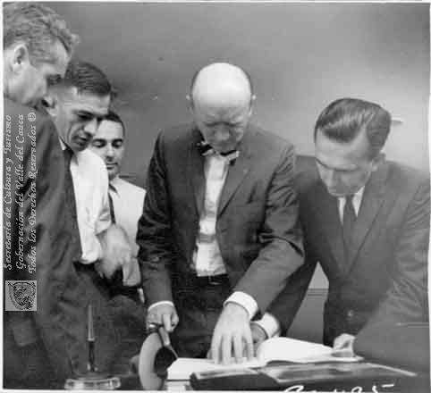 A. J. Posada, F. Williamson, J. L. Elmans, participants en la licitación para la construcción de la Represa de Calima. Santiagod e Cali, 1.961