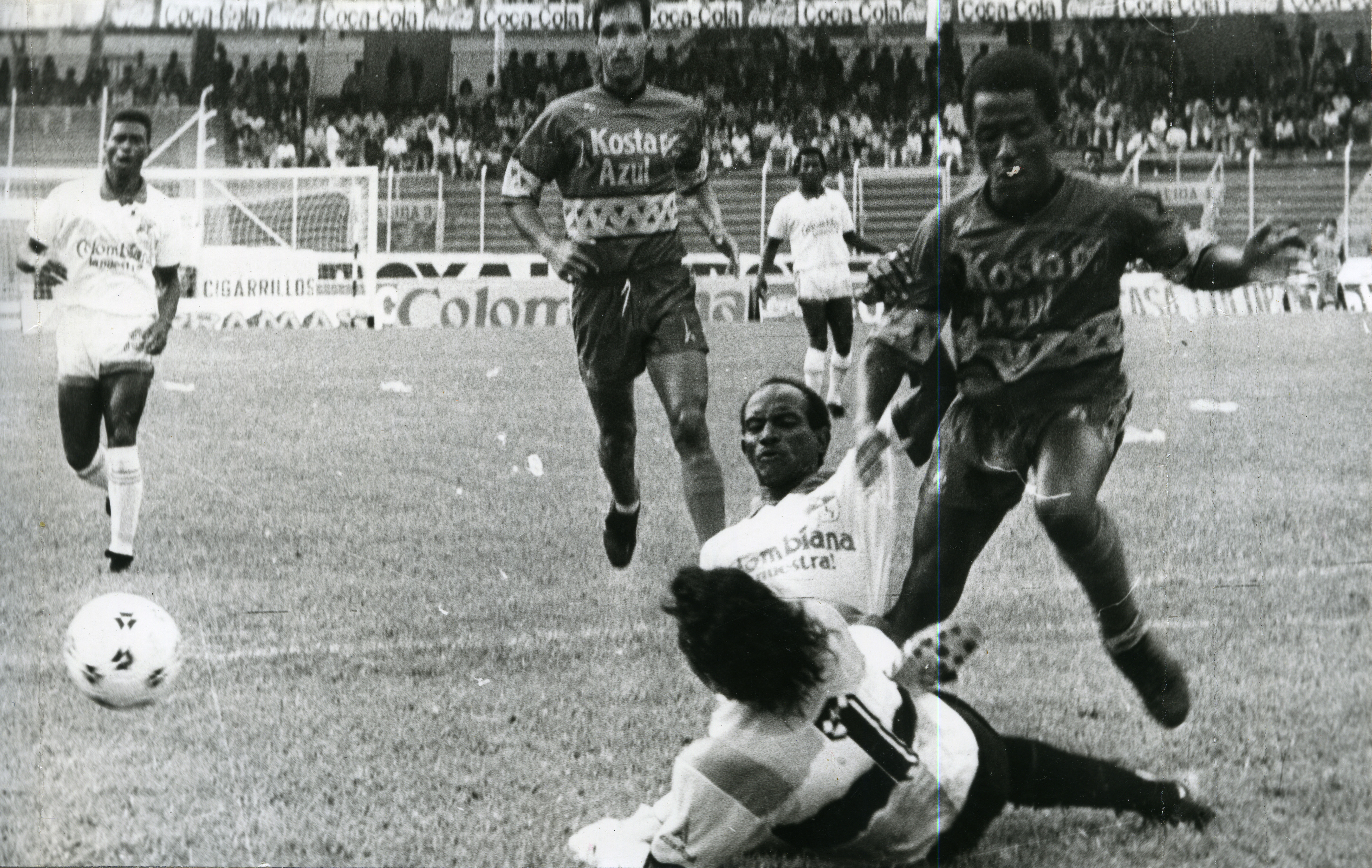 Partido entre los equipos de fútbol, Deportivo Cali y Pereira realizado en el Estadio Olímpico Pascual Guerrero. Se aprecia a Carlos "La Gambeta" Estrada, disputa balón con el portero