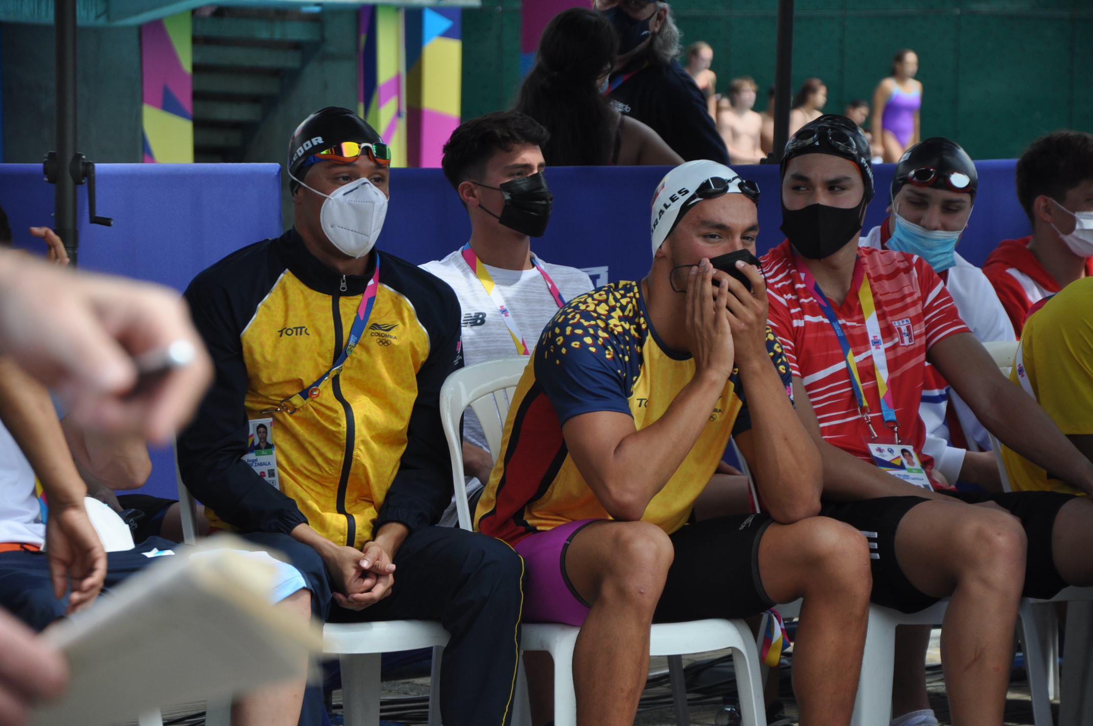 En la fotografía podemos observar a los participantes de la competencia de natación en los "I Juegos Panamericanos Junior" llevados a cabo en la ciudad de Cali.