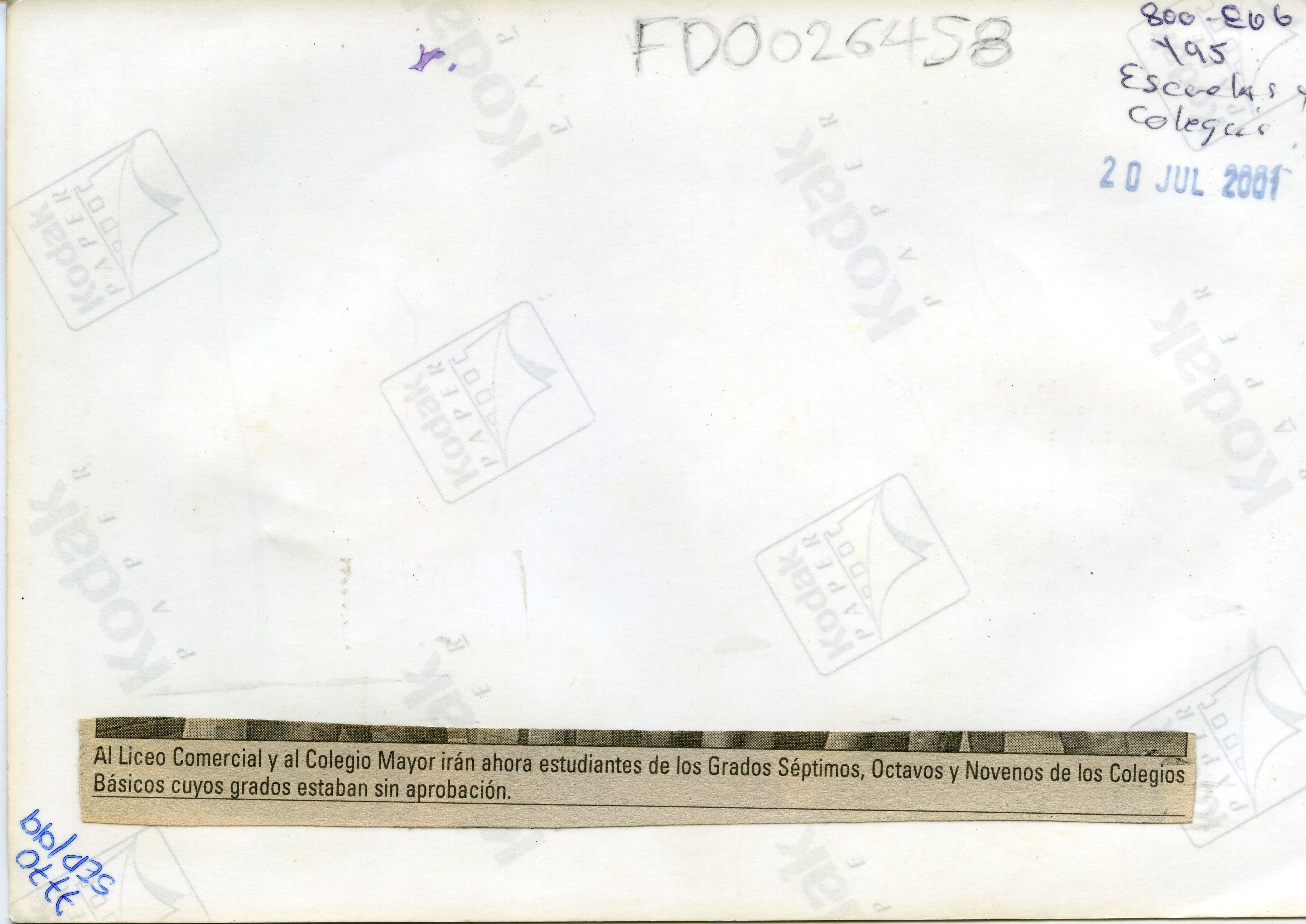 | dc.description.abstract | Al reverso de la fotografía se anexa recorte: Al Liceo Comercial y Colegio Mayor irán ahora estudiantes de los grados séptimos, octavos y novenos de los colegios Básicos cuyos grados estaban sin aprobación. | spa |