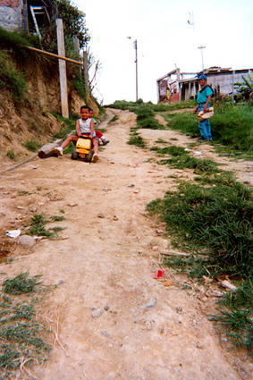 Exterior día. Por un camino de tierra vienen bajando dos niños montados en un carrito amarillo de plástico. Un señor los observa mientras se ríe. Cielo blanco atrás.
