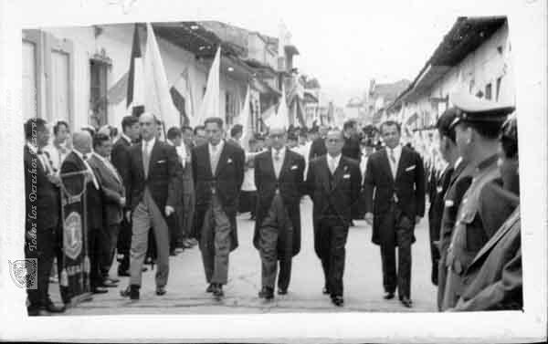Desfile con motivo de la inauguración de la Diócesis de Cartago. Se identificó a Humberto Vélez, Jesús María Murgueitio, Fernando Londoño, Luis Alfonso Delgado. Cartago, 1962.