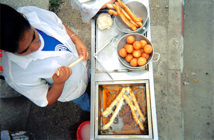 Primer plano. Toma cenital. Señora en puesto ambulante. Dedos de queso fritándose. Al lado derecho buñuelos y dedos de queso listos para su consumo.