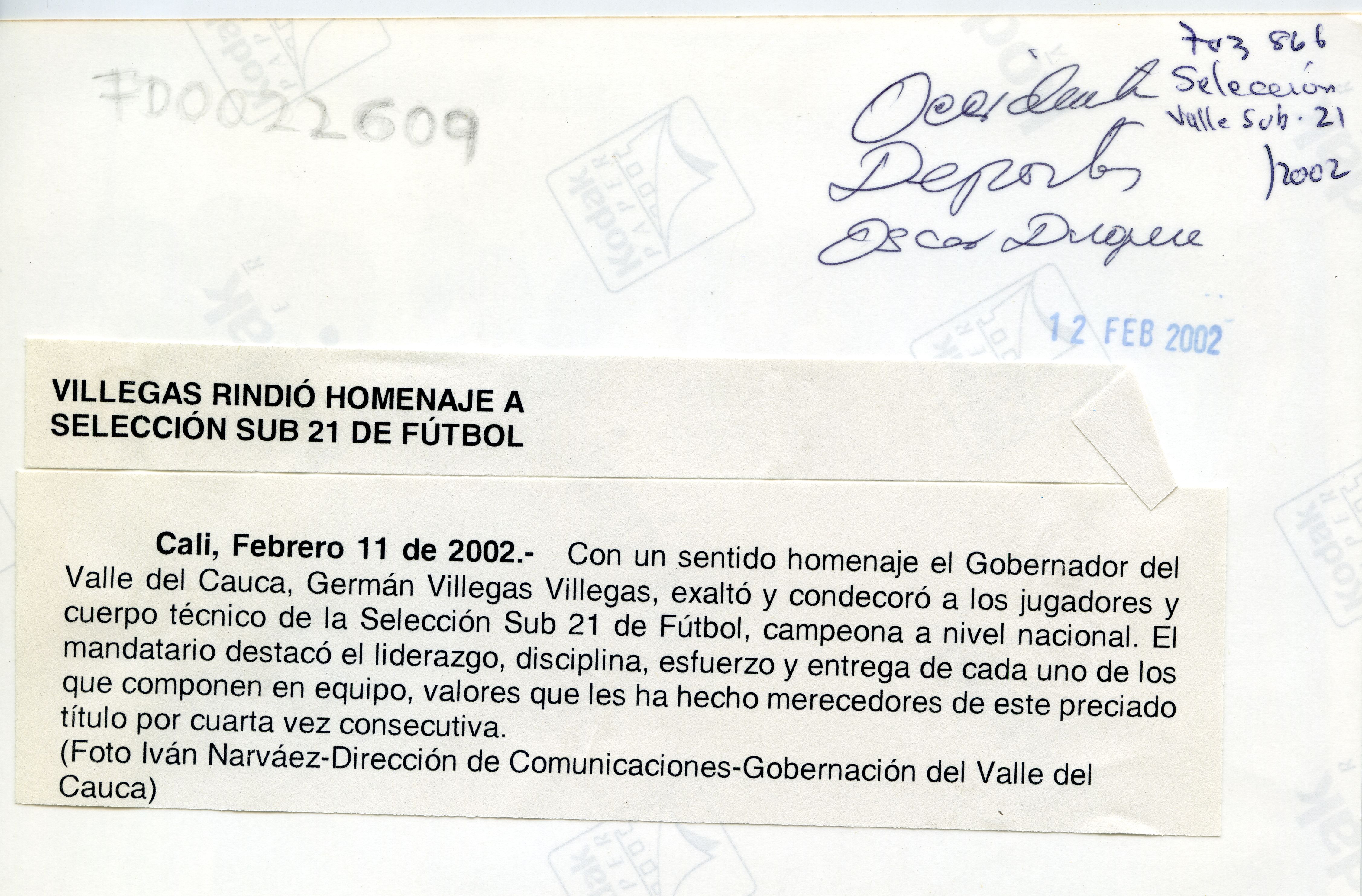 | dc.description.abstract | Al reverso de la fotografía se anexa escrito: Cali febrero 11 de 2002. Con un sentido Homenaje el gobernador del Valle del Cauca, Gemán Villegas Villegas, exaltó y condecoró a los jugadores y cuerpo técnico de la selección sub 21 de fútbol, campeona a nivel nacional. El mandatario dastacó el liderazgo, diciplina, esfuerzo y entrega de cada uno que componen el equipo, valores que les ha hecho merecedores de este preciado título por cuarta vez consecutiva. Foto Iván Narváez - Dirección de comunicaciones - Gobernación del Valle del Cauca | spa |