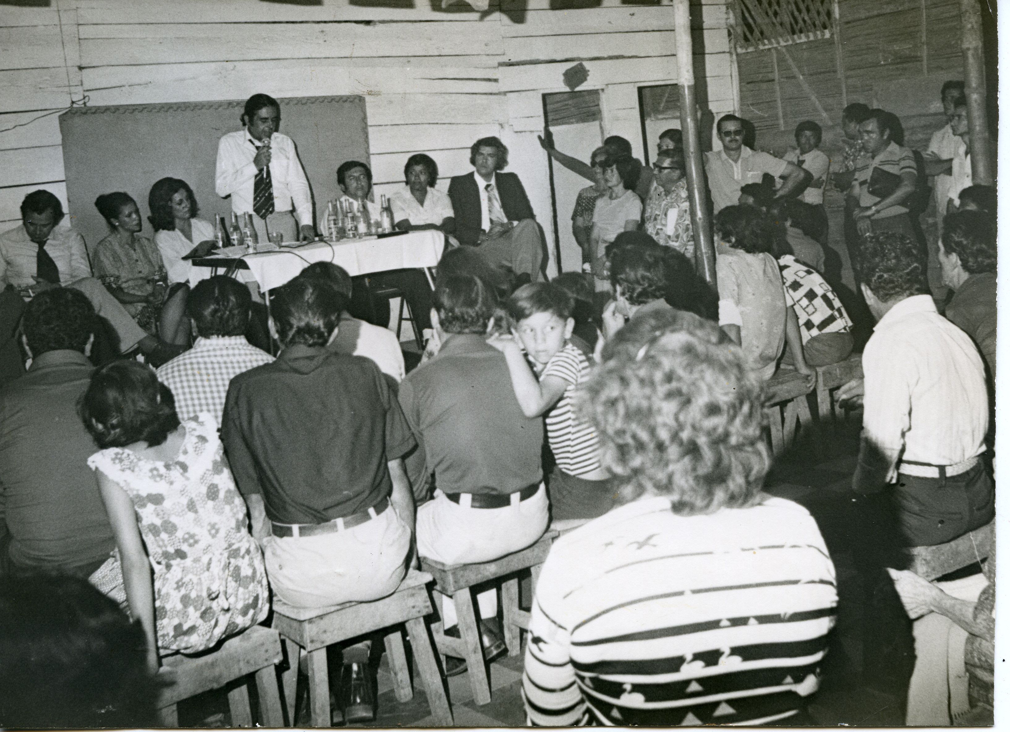 En la fotografía se aprecia a Ernesto González Caicedo, en una reunión comunal durante se mandato en la alcaldía de Cali, en un recinto cerrado de madera y bambú.