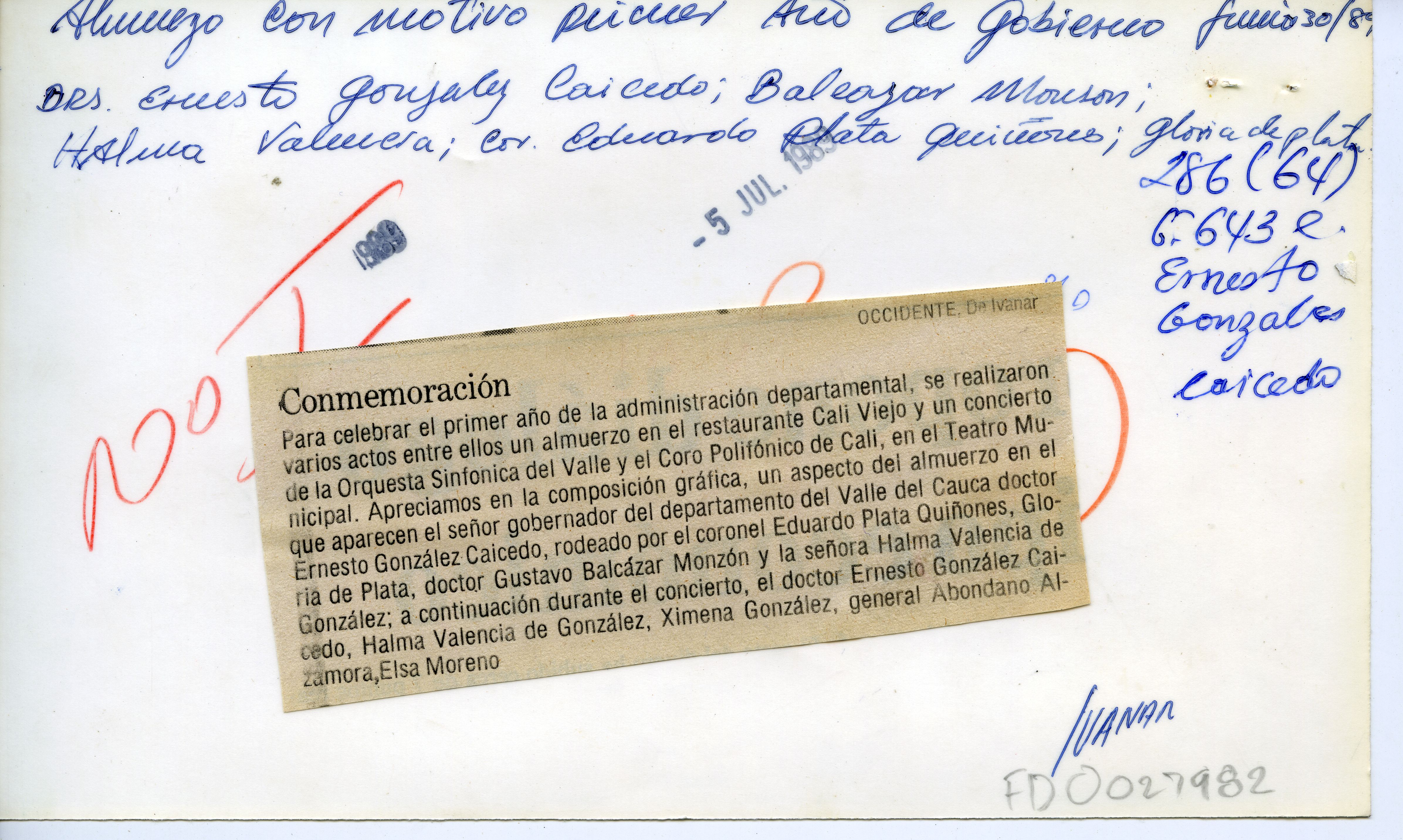 En la imagen es posible detallar la reunión de diferentes figuras publicas de poder almorzando en el restaurante "Cali Viejo". Entre las personajes presentes es posible distinguir al gobernador Ernesto González a su lado se encuentra el coronel Eduardo Plata Quiñonez, gloria de Plata, el doctor Gustavo Balcázar Monzón y La señora Halma Valencia de González.