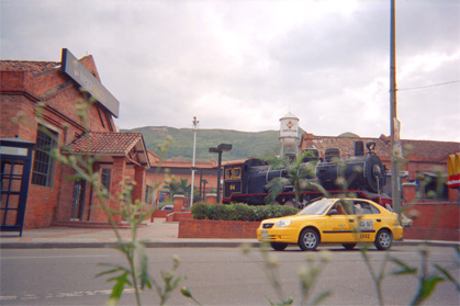 Imagen del centro comercial Chipichape en la cual se destaca la locomotora ubicada en la parte externa del mismo. En primer plano unas ramas sugieren la presencia de vegetación en la zona. Un taxi espera recoger algún pasajero. Al fondo el centro comercial con terminación en ladrillo limpio. En el plano medio por encima de la edificación montaña posterior al centro comercial.