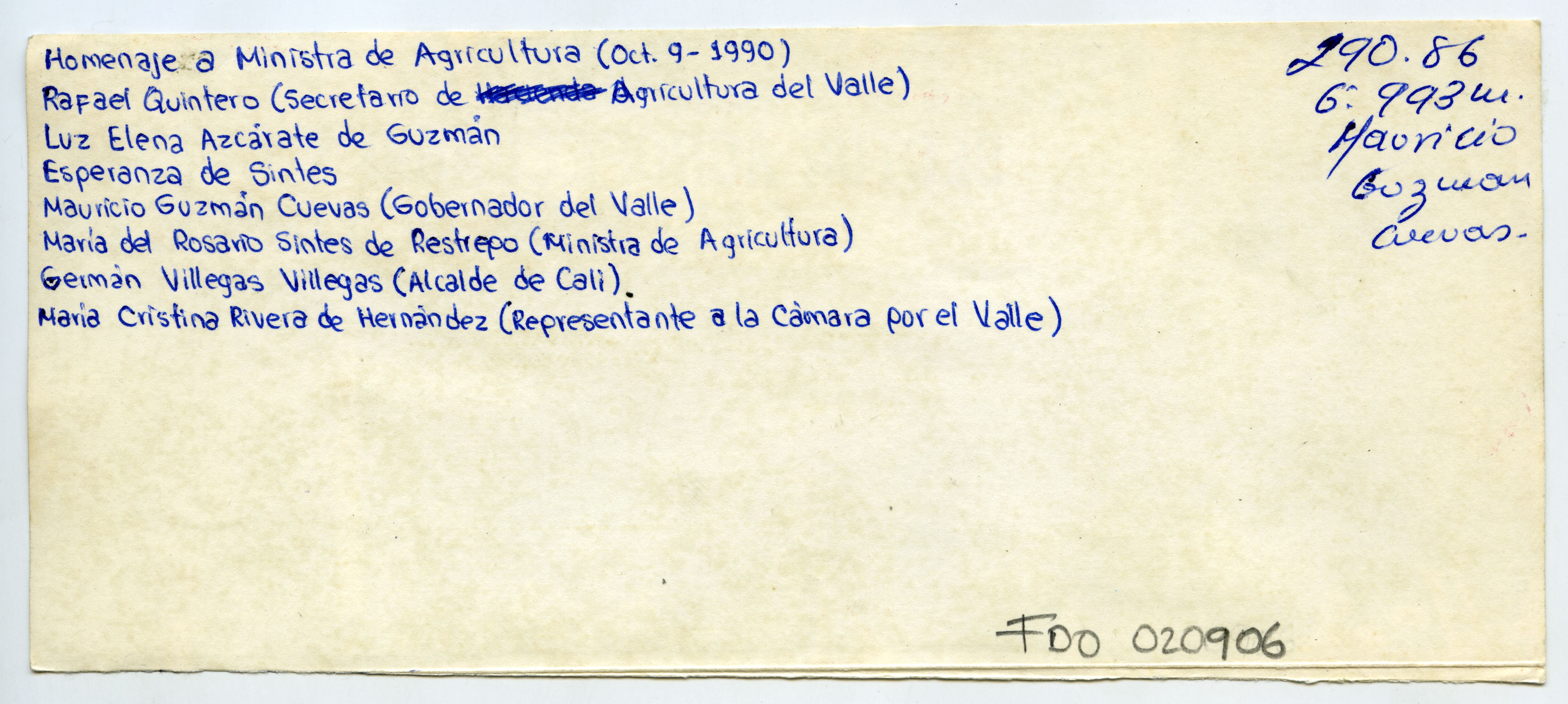 Homenaje a Ministra de Agricultura. De izquierda a derecha: Rafael Quintero, secretario agricultura del Valle; Luz Elena Azcárate de Guzmán; primera dama departamento, Esperanza de Sinles, Mauricio Guzmán Cuevas, Gobernador del Valle, María del Rosario Sinles de Restrepo, ministra de Agricultura, Germán Villegas Villegas, alcalde Cali, María Cristina Rivera de Hernández, representante a la cámara por el Valle