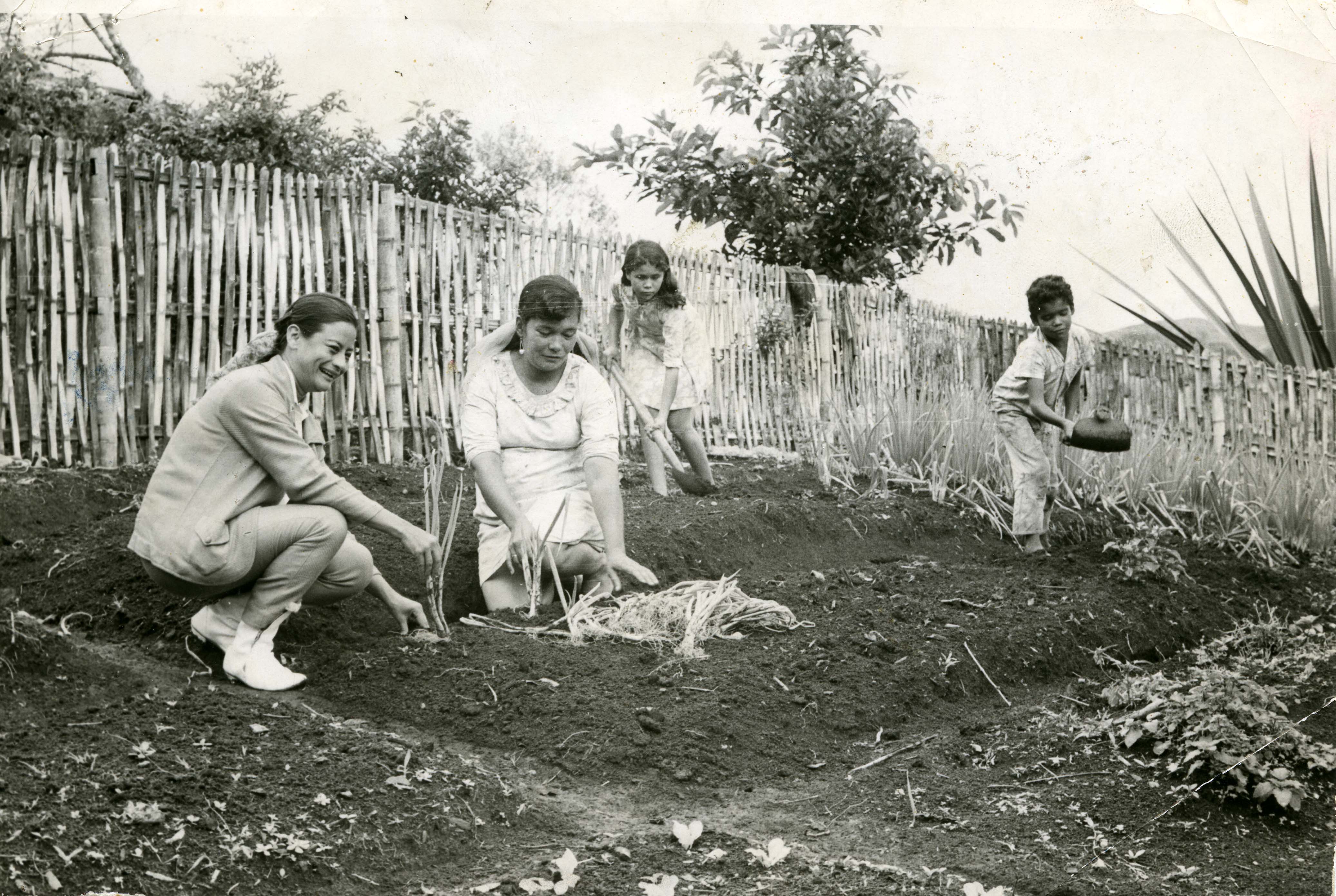 La gráfica muestra a mujeres y niñas/os campesinas trabajando en cultivo