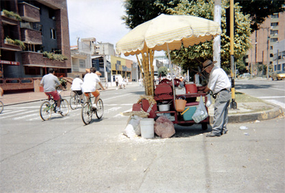 Imagen de la ciclovía en la calle novena con 42. Se destaca un hombre vendedor de guarapo de caña. Al lado izquierdo hombres transitan en bicicleta. Plano general.