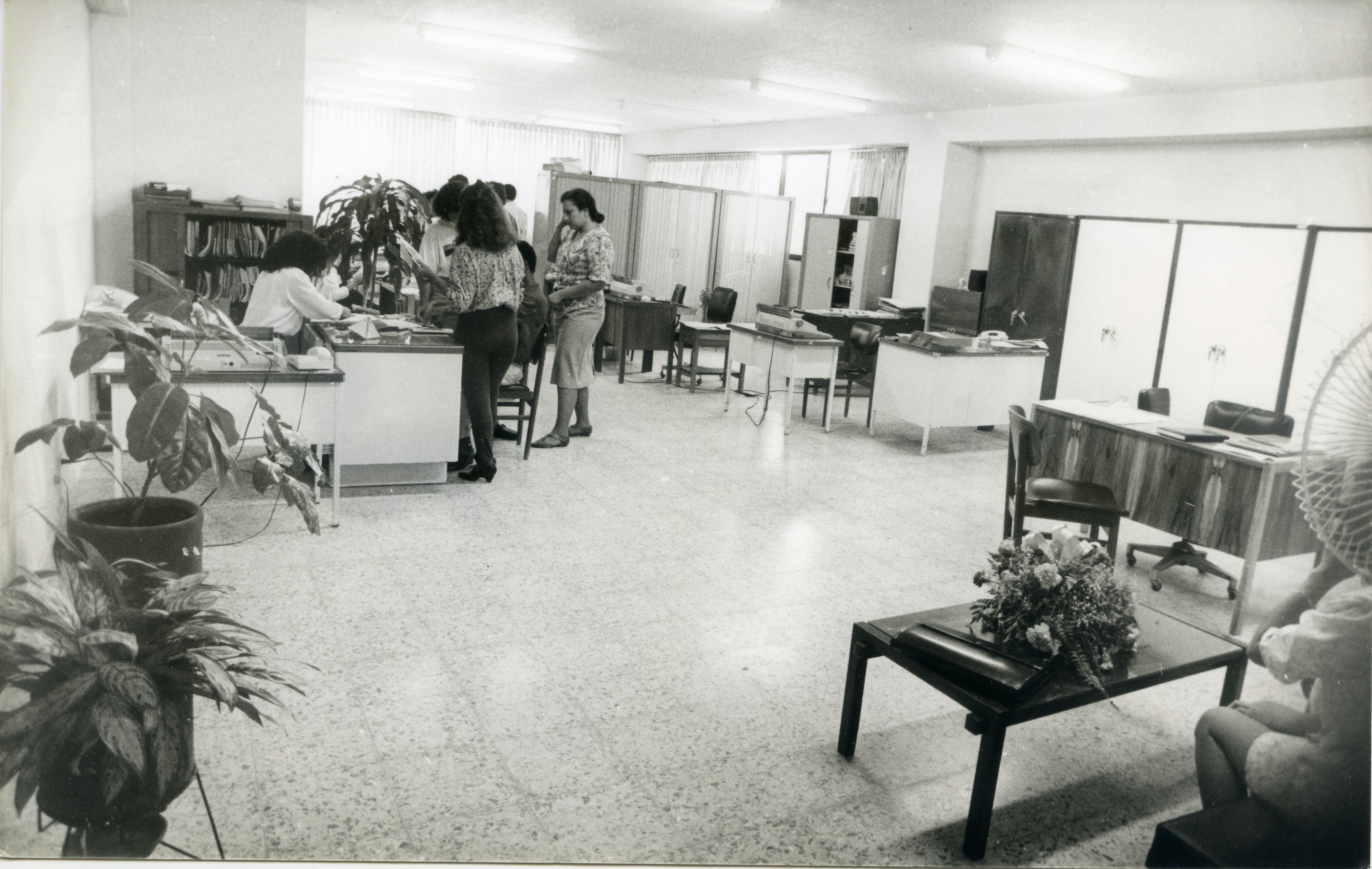 Interior de las oficinas de la Secretaría General de la Universidad Santiago de Cali, se puede observar algunas funcionarias agrupadas en un escritorio, los demás escritorios se encuentran vacíos.