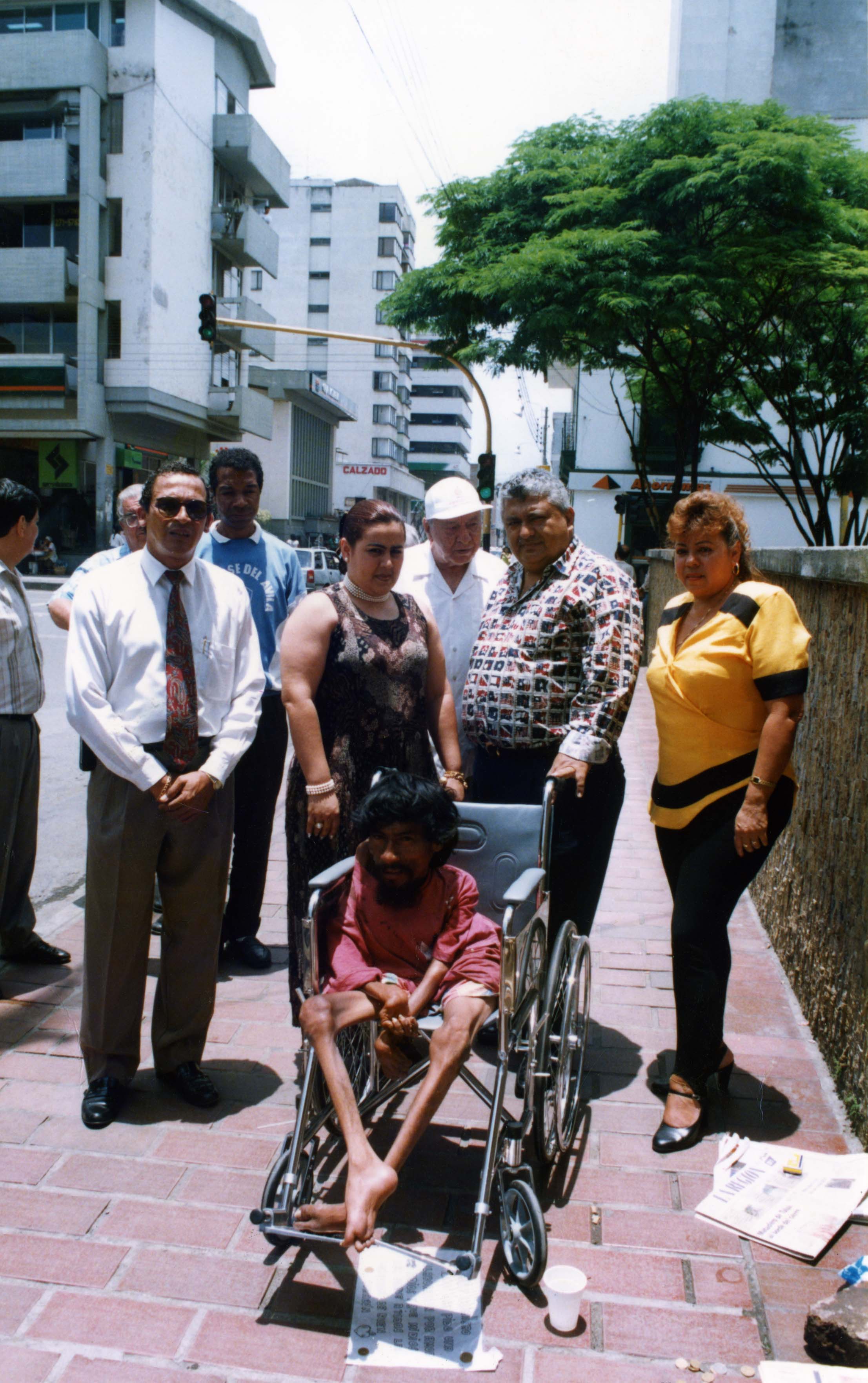 En el pie de foto dice lo siguiente: Tan sólo en ocho días el periodista Eduardo Jaramillo le consiguó en una campaña una silla de ruedas al artista minusvalido Carlos Humberto Vallejo y ya la misma fue atendida por personas generosas de la ciudad como los esposos Fabio Cano y María Elsy Benavides, quienes obsequiaron la silla al citado artista.- El Archivo del Patrimonio Fotográfico y Fílmico del Valle del Cauca es responsabilidad de la Biblioteca Departamental del Valle Jorge Garcés Borrero, por convenio de cooperación suscrito con la Secretaria del Cultura Departamental, con el fin de aunar esfuerzos para su conservación, preservación y divulgación del Archivo entre la comunidad Vallecaucana, especialmente entre los estudiantes e investigadores que visitan la Biblioteca, propiciando el su uso y consulta permanente. La universidad Icesi es un colaborador en el proceso de difusión, facilitando la tecnología que permite la consulta de las imágenes.