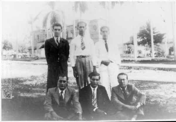 Alberto escobar, Humberto Gónzalez, Julio Mario Arana, Gerardo Escobar, Alfredo Caicedo y Numa Pompilio G. reunidos en el parque central. Bugalagrande. C.1945.