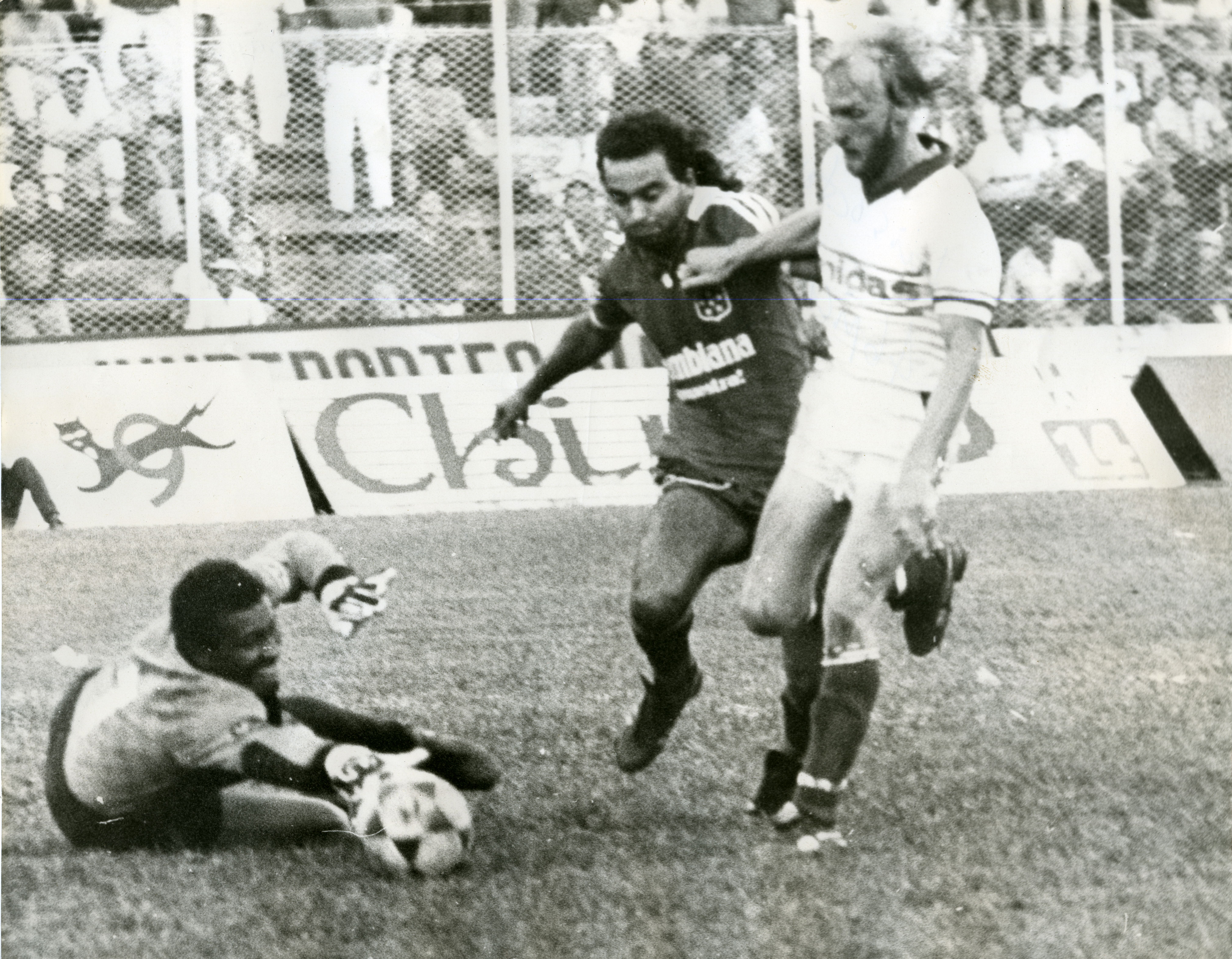 Partido en el estadio Olímpico Pascual Guerrero entre América de Cali vs Medellín. Se aprecia al portero Luis Octavio Gómez, Juan Manuel Battaglia en escena