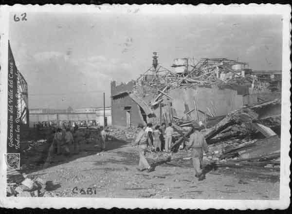 Edificacion completamente en ruinas. Cuerpo de Bomberos en el sitio de la explosión del 7 de agosto. Cali, 1956.