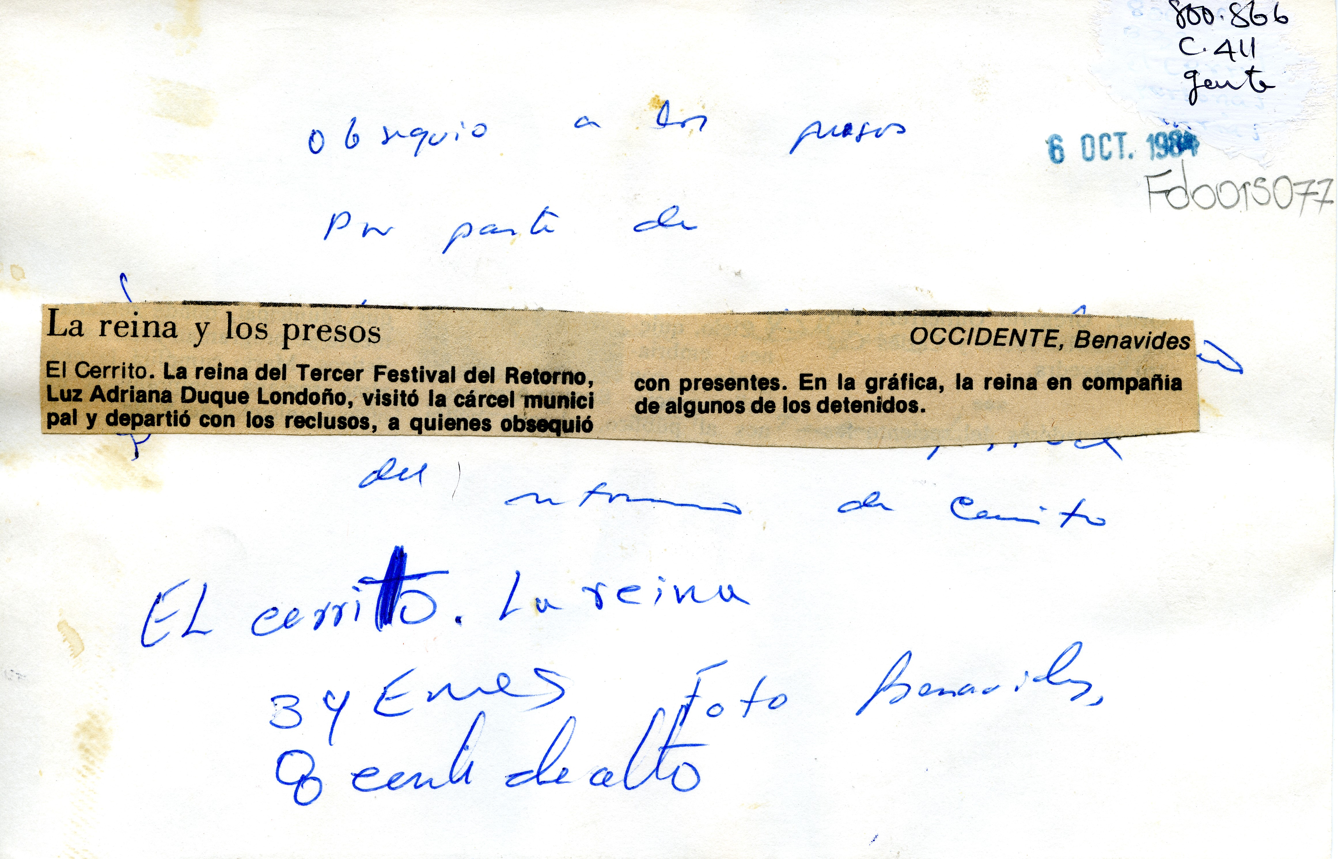 Luz Adriana Duque Londoño, Reina del Tercer Festival del Retorno, junto a reclusos de la cárcel de El Cerrito. Al reverso de la fotografía se anexa un recorte:" La reina y los presos. El Cerrito. La reina del Tercer Festival del Retorno, Luz Adriana Duque Londoño, visitó la cárcel municipal y departió con los reclusos, a quienes obsequió con presentes. En la gráfica, la reina en compañía de algunos de los detenidos."