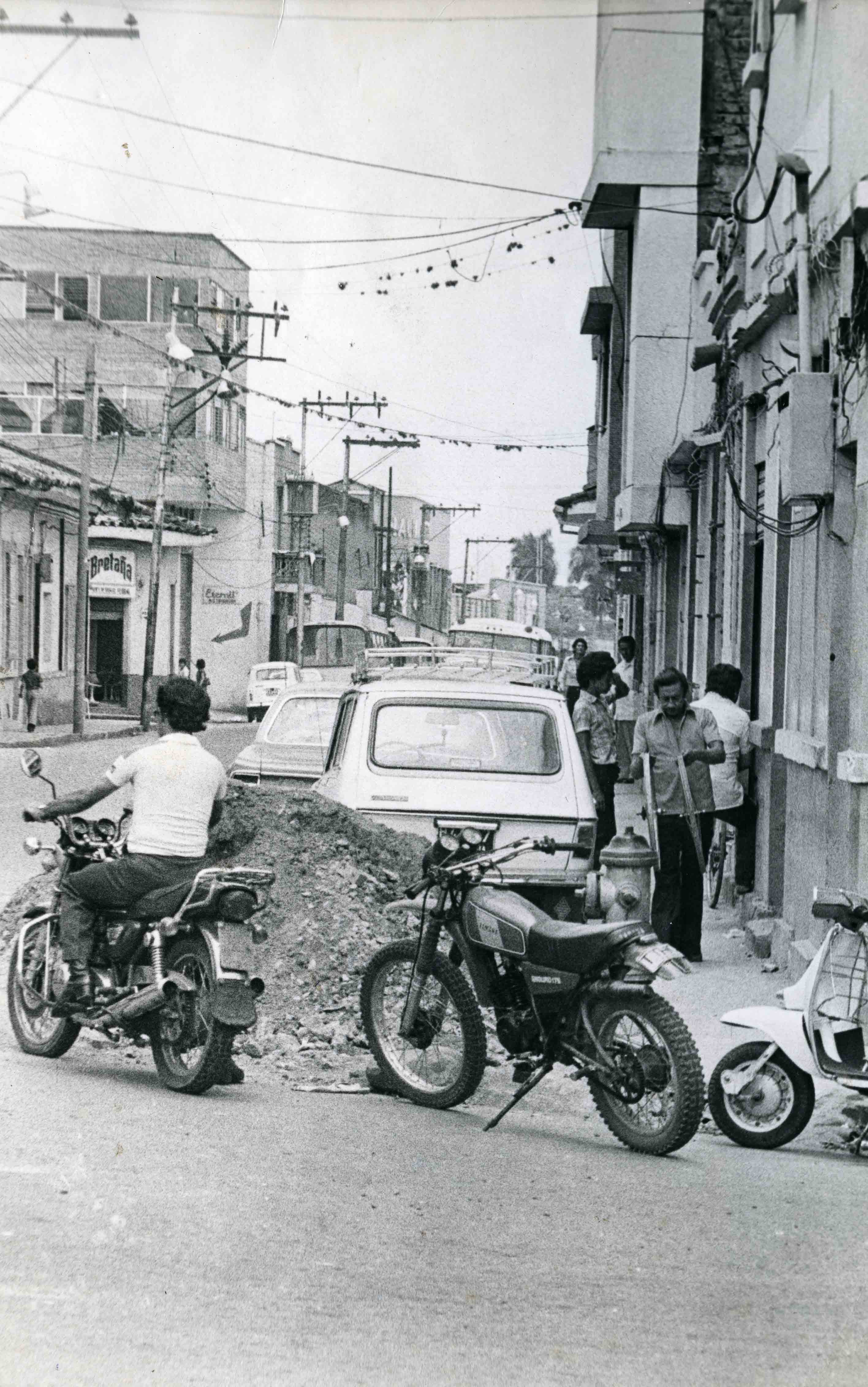 Motos en el Barrio San Nicolás, Carrera 7A con Calle 20 en Santiago de Cali >El Archivo del Patrimonio Fotográfico y Fílmico del Valle del Cauca es responsabilidad de la Biblioteca Departamental del Valle Jorge Garcés Borrero, por convenio de cooperación suscrito con la Secretaria del Cultura Departamental, con el fin de aunar esfuerzos para su conservación, preservación y divulgación del Archivo entre la comunidad Vallecaucana, especialmente entre los estudiantes e investigadores que visitan la Biblioteca, propiciando el su uso y consulta permanente. La universidad Icesi es un colaborador en el proceso de difusión, facilitando la tecnología que permite la consulta de las imágenes.