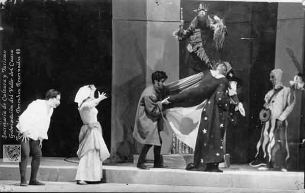 Yolanda García, Danilo Tenorio, Iván Montoya, Jorge Herrera y otros actores del TEC, en la obra " El espantapájaros que quería ser Rey" de A. Malfatti. TEC. Cali. 1965.