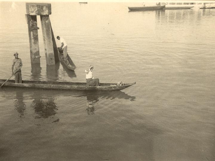 Don Ismael saliendo del muelle del puerto en una canoa. Buenaventura, 1963