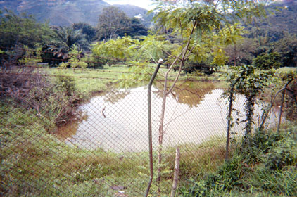 Plano general. Exterior día. Lago como punto distintivo de escena. Reja con formas geométricas superpuestas, aporta simetría a composición. Vegetación abundante.