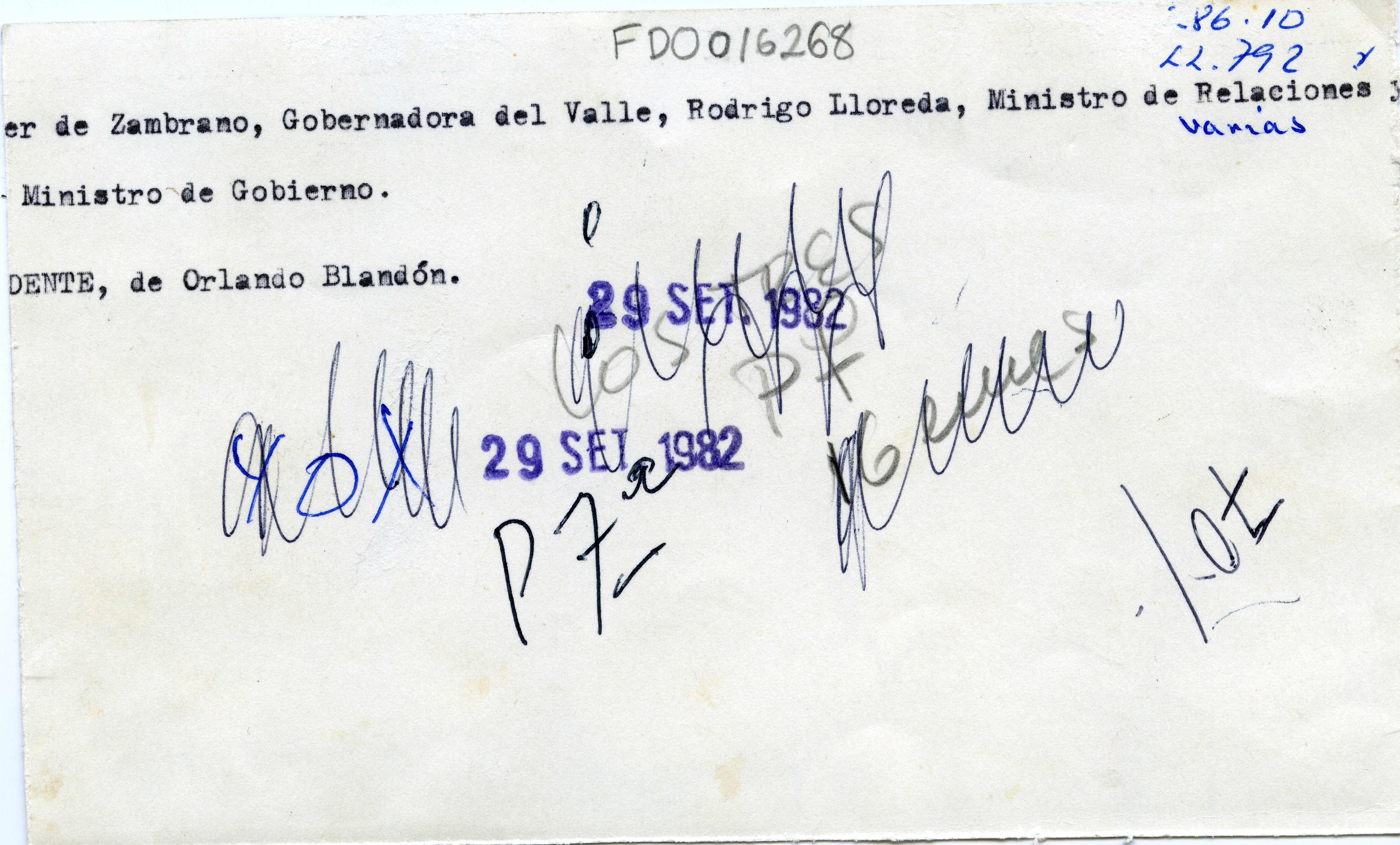 Al reverso de la fotografía se anexa recorte:"Comisión oceanográfica. En la Cámara de Comercio de Cali se instaló ayer la comisión oceanográfica intergubernamental que estudiará el fenómeno El Niño, una especie de alteración climática que está afectando al mar y que desplaza intempestivamente millones de peces a otras regiones. En la gráfica, de izquierda a derecha, aparecen la Gobernadora del Valle, Doris Eder de Zambrano; el canciller Rodrigo Lloreda Caicedo; el presidente de la comisión Richard Barber; el alcalde de Cali, Julio Riascos, el rector de la Universidad del Valle, Rodrigo Guerrero; el almirante Gilberto Barona y el jefe de relaciones comerciales de la Cámara, Luis Hernán Velasco". Se anexa otro recorte "Está escena corresponde a la Ceremonia presedida por Rodrigo Lloreda Caicedo en la instalación de la Comisión Oceanográfica intergubernamental para estudiar el fenómeno de "El Niño". Esto fue en 1983 y aparecen de izquierda a derecha: Doris Eder Zambrano, Gobernadora del Valle del Cauca; El Canciller Rodrigo Lloreda Caicedo, El presidente de la Comisión Richard Barber; El Alcalde de Cali, Julio Riascos Alvarez; El Rector de la Universidad del Valle, Rodrigo Guerrero Velasco; El Almirante Gilberto Barona, y el jefe de Relaciones Comerciales de la Cámara, Luis Hernán Velasco.