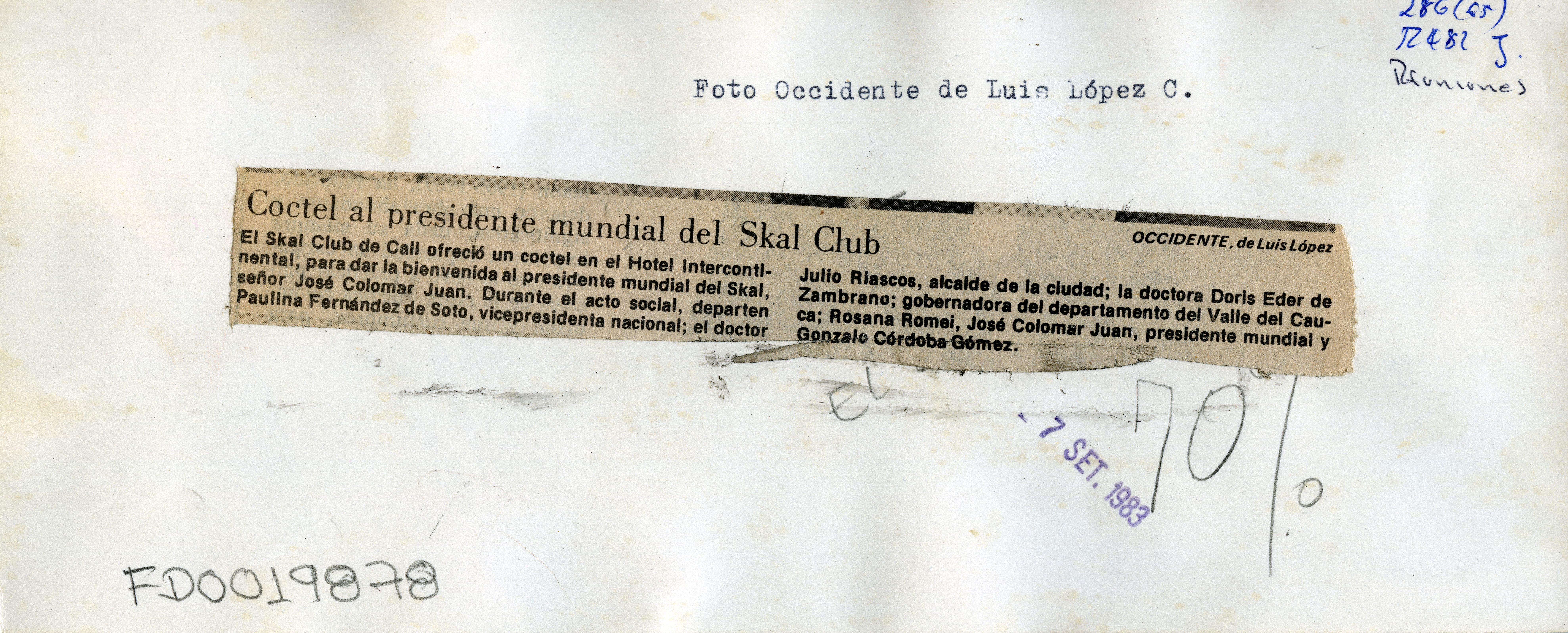 El Skal Club de Cali ofreció un coctel en el Hotel intercontinental para dar la bienvenida al presidente mundial del Skal, señor José Colomar Juan. Durante el acto social departen Paulina Fernández de Soto, vicepresidenta nacional; el doctor Julio Riascos, alcalde de la ciudad; la doctora Doris Eder de Zambrano; gobernadora del departamento del Valle del Cauca; Rosana Romei, José Colomar Juan, presidente mundial y Gonzalo Córdoba Gómez