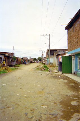Plano general. Vía sin pavimentar y a lado y lado de ella la fachada de algunas viviendas. Calle que separa el asentamiento del barrio Comuneros II.