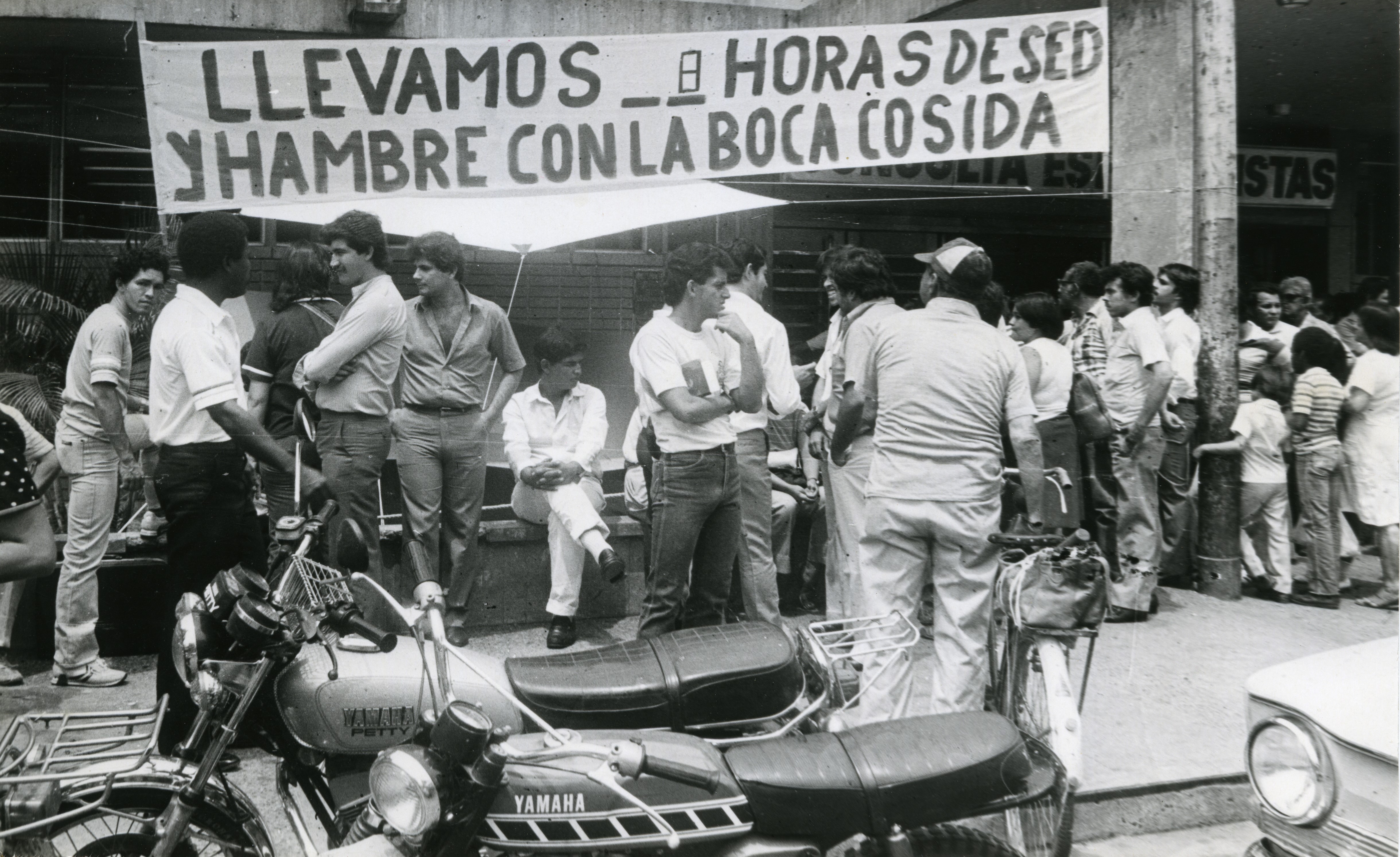 En la foto se ve a los manifestantes levantando dos dedos de la mano, haciendo el simbolo de la paz y al mismo tiempo tapan sus caras. Al reverso dice: ¨Universitarios de salud. Huelga de hambre¨