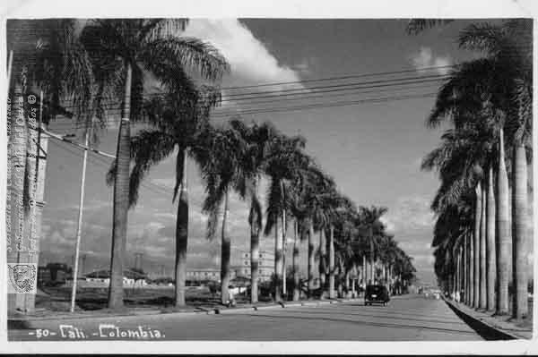 Avenida Miguel López Muñoz, ( hoy Calle 25) sembrada de palmeras a los lados dejando una hermosa vista que hoy ha desaparecido en aras del progreso. Santiago de Cali. Fecha aproximada: 1940.