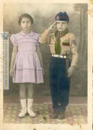 Carmen Helena y Héctor Fabio Arias. Fotografía iluminada a mano. El jóven Arias viste uniforme de Boy Scout . Candelaria. C. 1920.