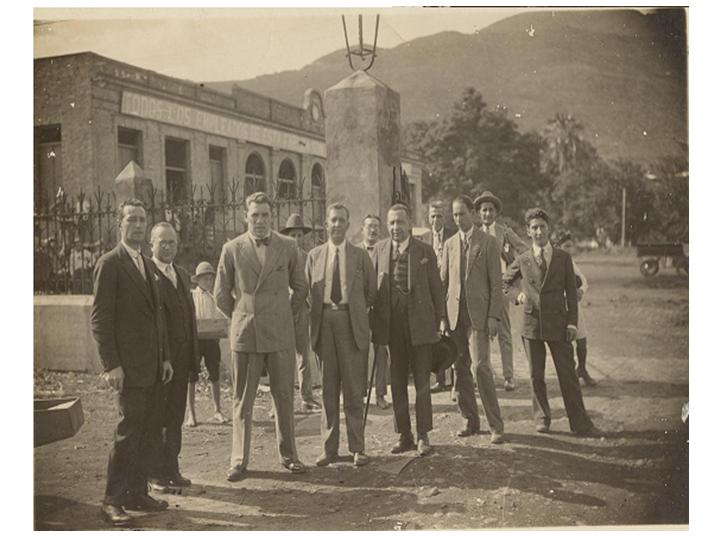 El boxeador Paulino Uscudum frente a las instalaciones de la  cervecería "los Andes", rodeado de amigos. Santiago de Cali, 1928.