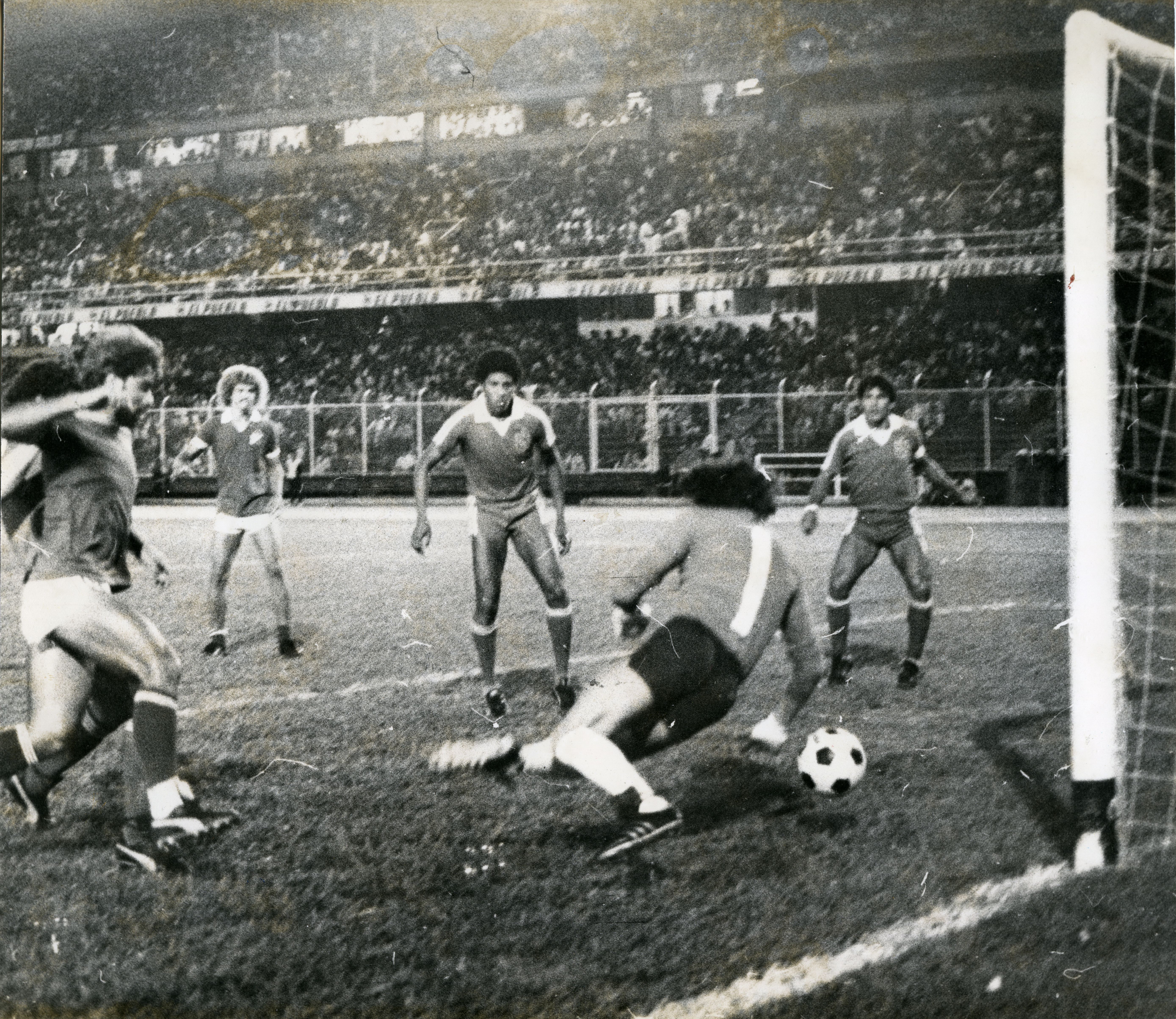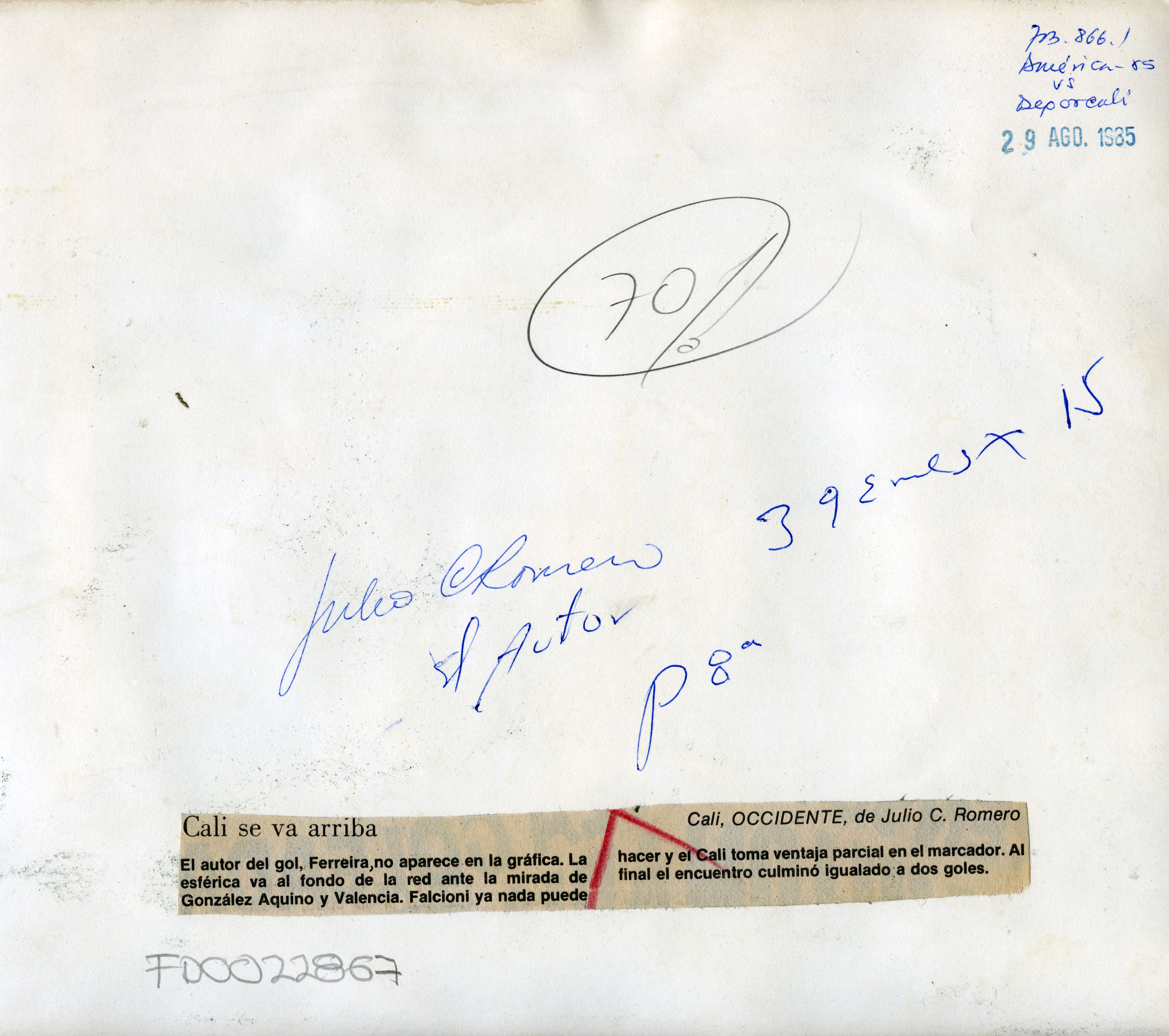 Deportivo Cali, club de fútbol colombiano del Valle del Cauca de la ciudad de Santiago de Cali, Sus inicios se remontan al 23 de noviembre de 1912 y posteriormente ha participado del fútbol profesional desde el año 1948 en donde ha obtenido 10 títulos como campeón del torneo colombiano al 2021, Campeón Copa Colombia 2010, Campeón Superliga de Colombia 2014, ha sido dos veces finalista de la Copa Libertadores de América. Partido fútbol entre los equipos América 2-2 Deportivo Cali, realizado en el estadio Pascual Guerrero. Se aprecia gol de Ferreira jugador del Cali. Observamos público en la tribuna