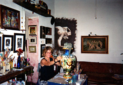 Plano medio. Interior. Mujer pintando. Enfoque central. Composición donde predominan las artes.