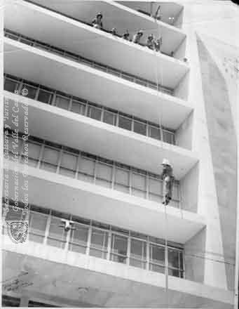 Maniobras del cuerpo de bomberos desde el antiguo edificio del Banco Popular, en la calle 12 con carrera 4 esquina. Cali. C. 1960.