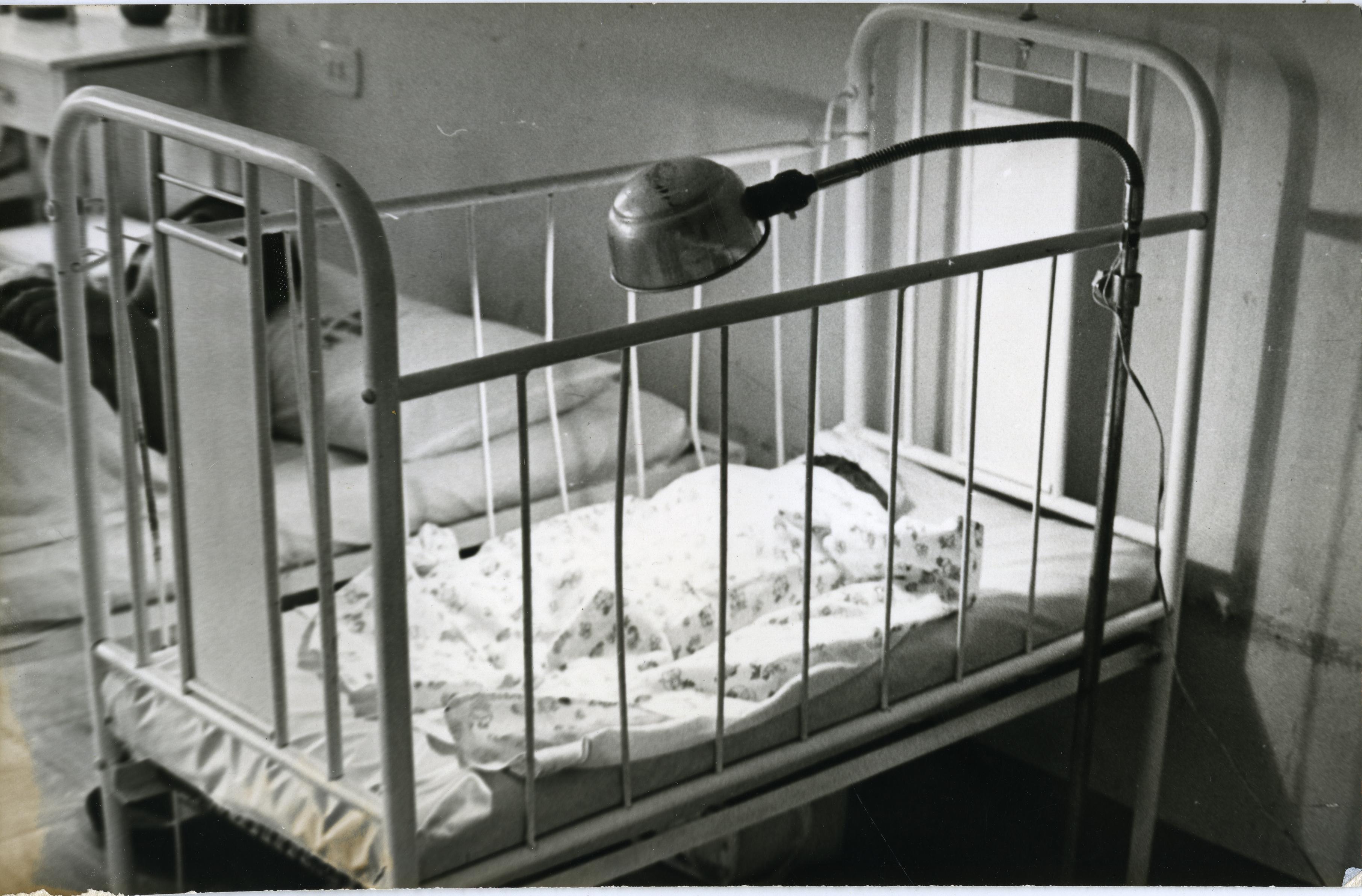 En la gráfica se observa un bebé recién nacido acostado en una cuna. Se observa una lámpara que le ayuda a conservar el calor.
