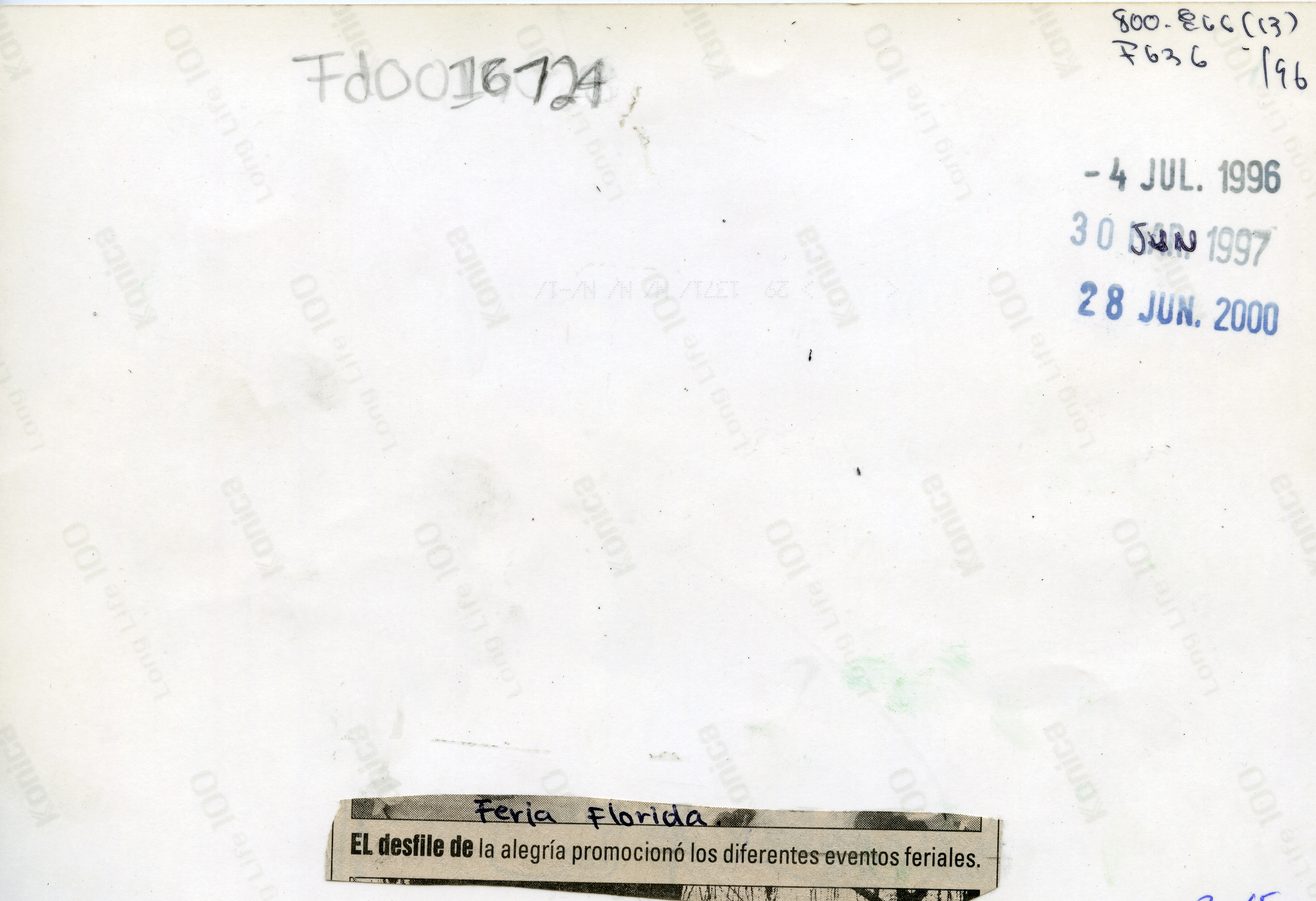 Al reverso de la fotografía se anexa recorte: "El desfile de la alegría promocionó los diferentes eventos feriales."