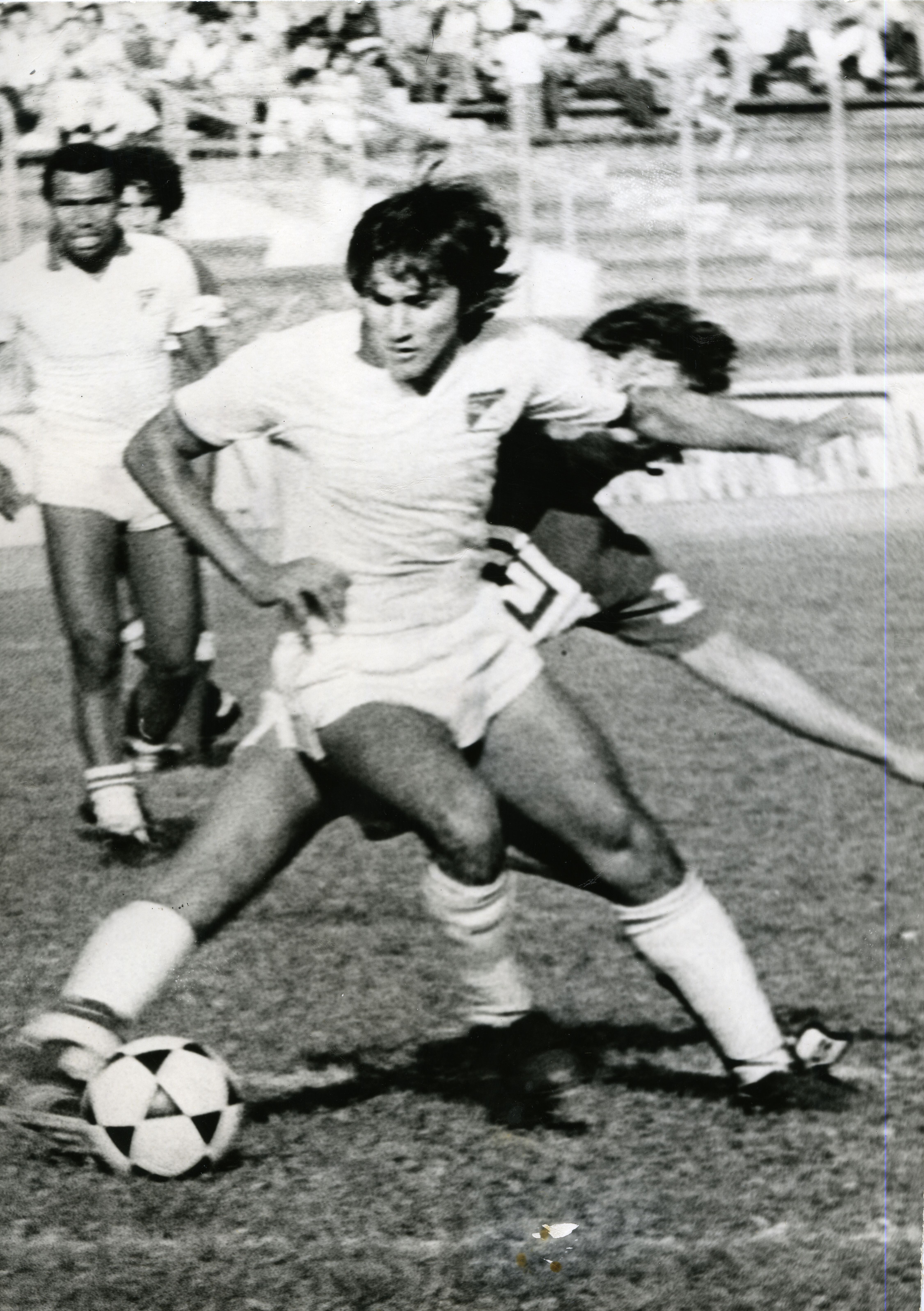 Partido de fútbol Cali vs Nacional en el estadio Olímpico Pascual Guerrero de Cali, Valle del Cauca. Se aprecia jugador del Deportivo Cali, Humberto Bravo luchando por el balón
