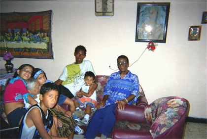 Familia de la autora reunida en la sala de su residencia. En la pared se aprecia cuadro de Jesucristo al lado derecho y otro en tela de la última cena. Plano medio. Interior día.