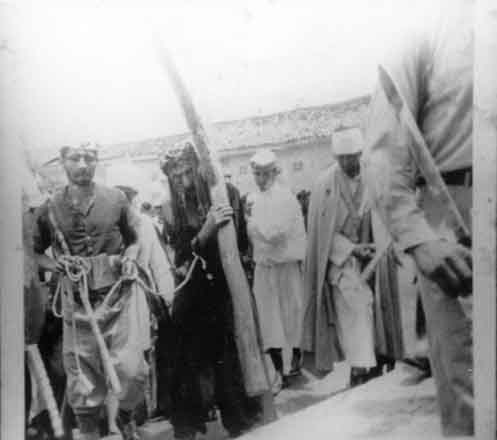 Tomás Reina personificando a Jesús cargando la cruz durante la celebración de la Semana Santa en vivo. Vijes, C. 1940.