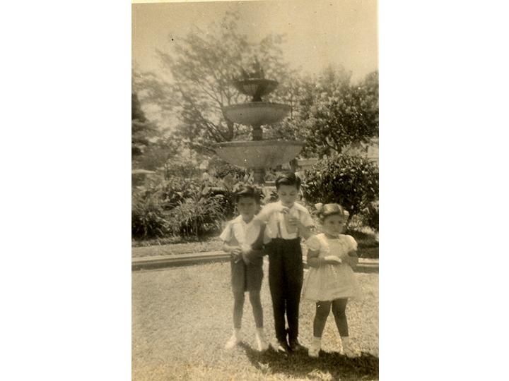 Los niños Eduardo, fabio y Stella Caicedo Montoya disfrutando de un paseo en el paseo Bolivar. Santiago de Cali,1957