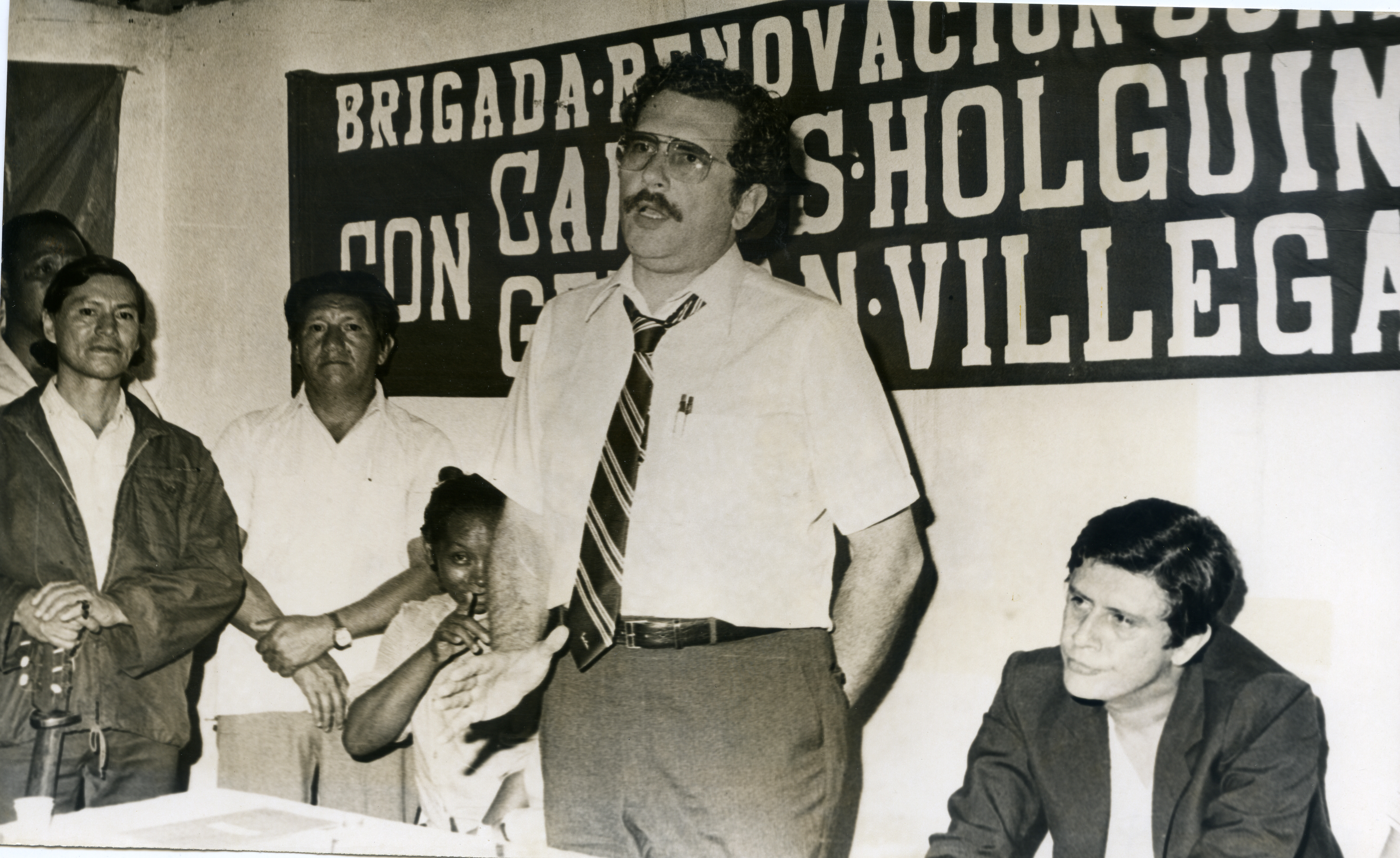 En la fotografía podemos observar a Carlos Holguín Sardi impartiendo su discurso a los seguidores de su campaña política, además está acompañado de Esther Panchano y de Roberto Londoño.